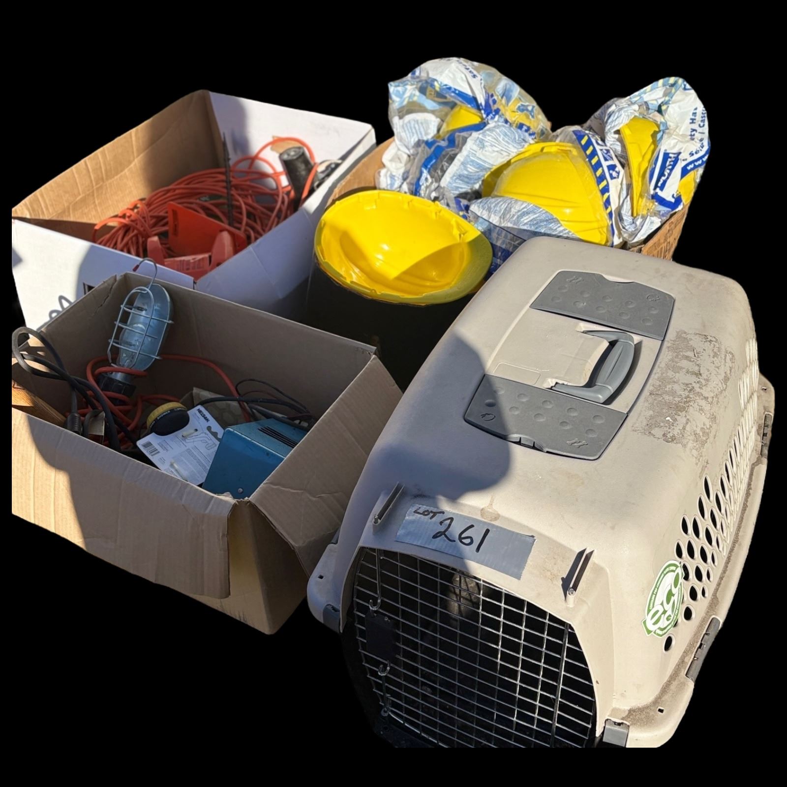 Extension Cord, battery charger, hard hats, hedge trimmer and dog kennel