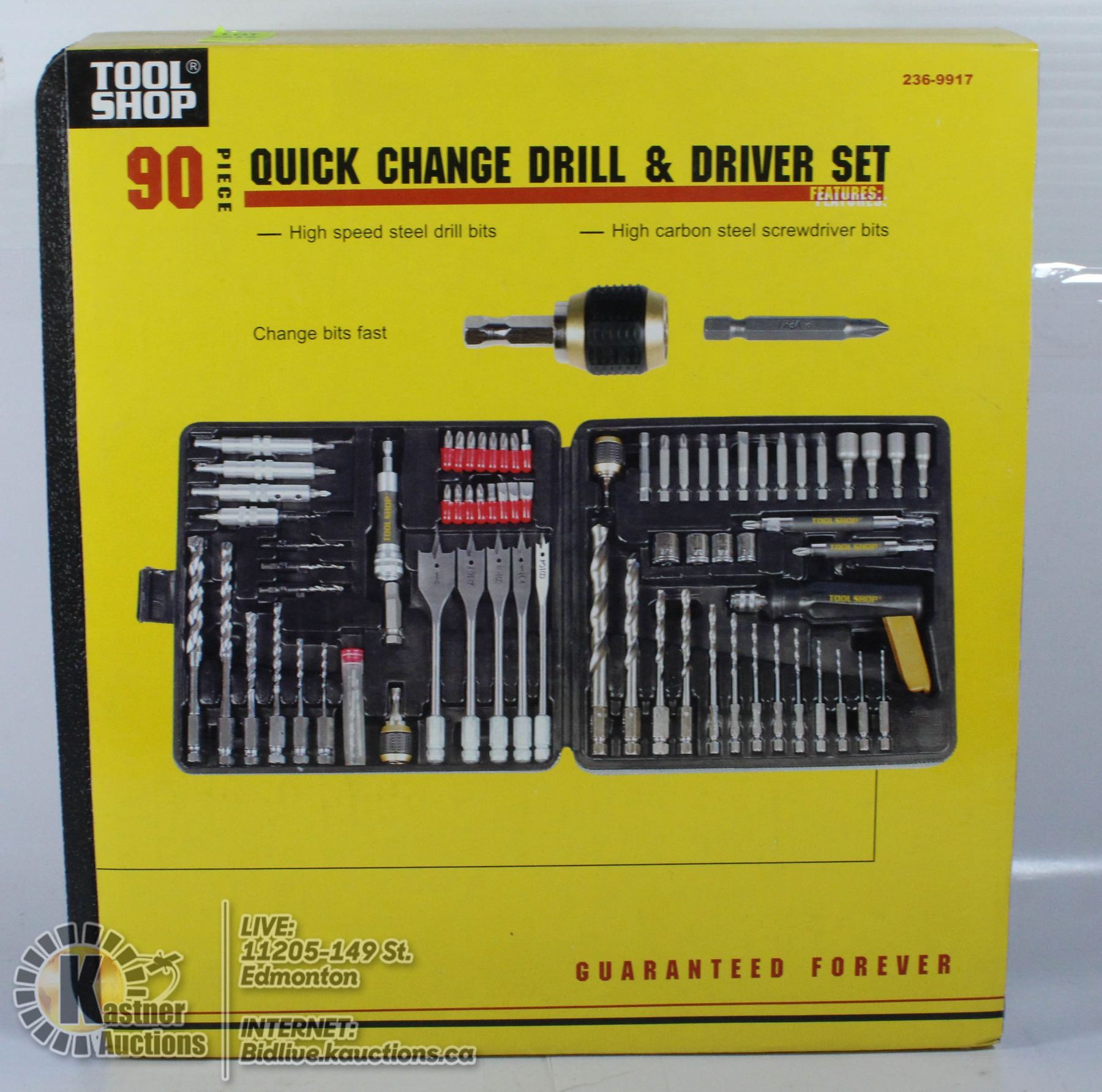 TOOL SHOP 90 PC QUICK CHANGE DRILL AND DRIVER SET.