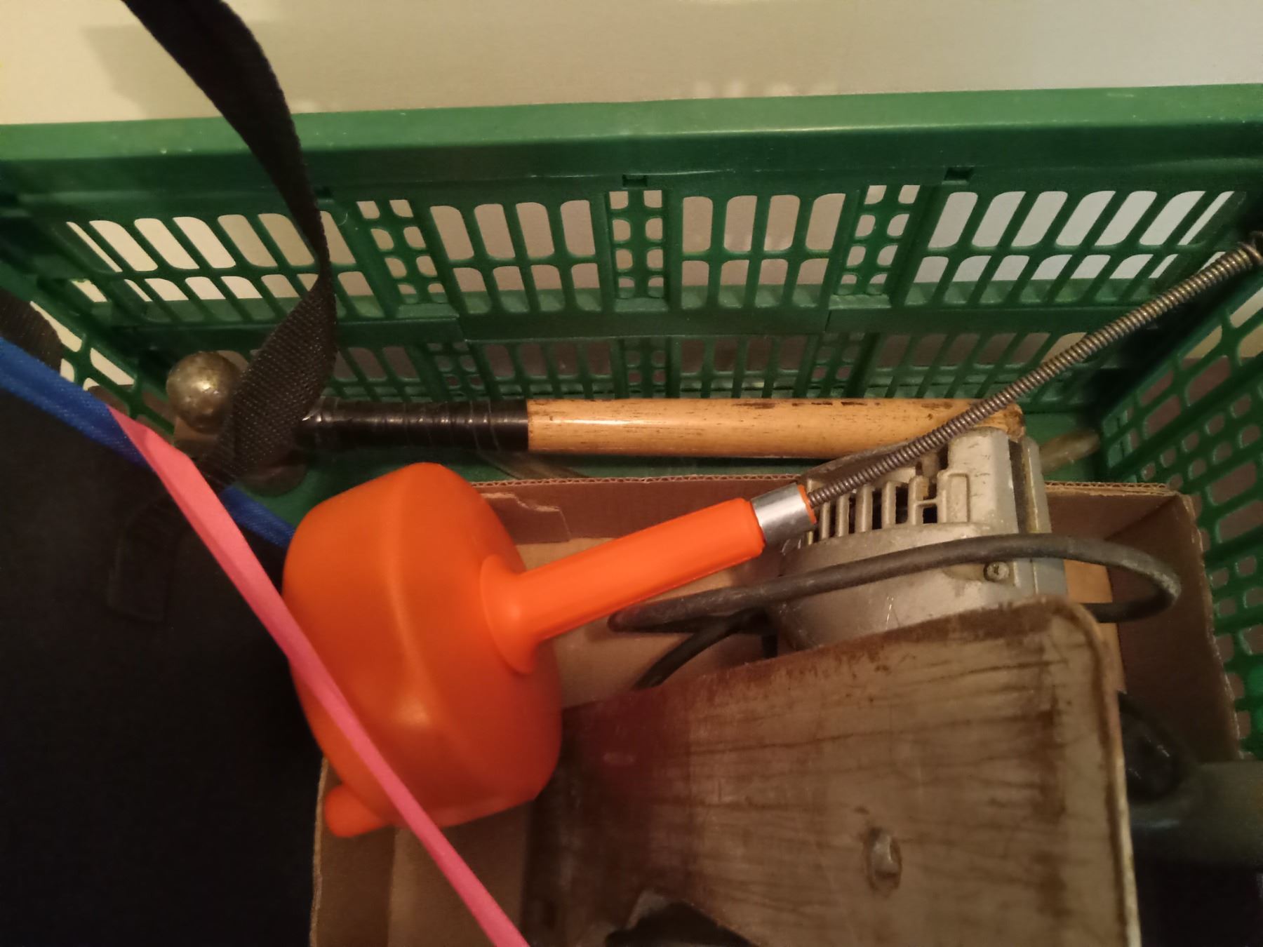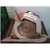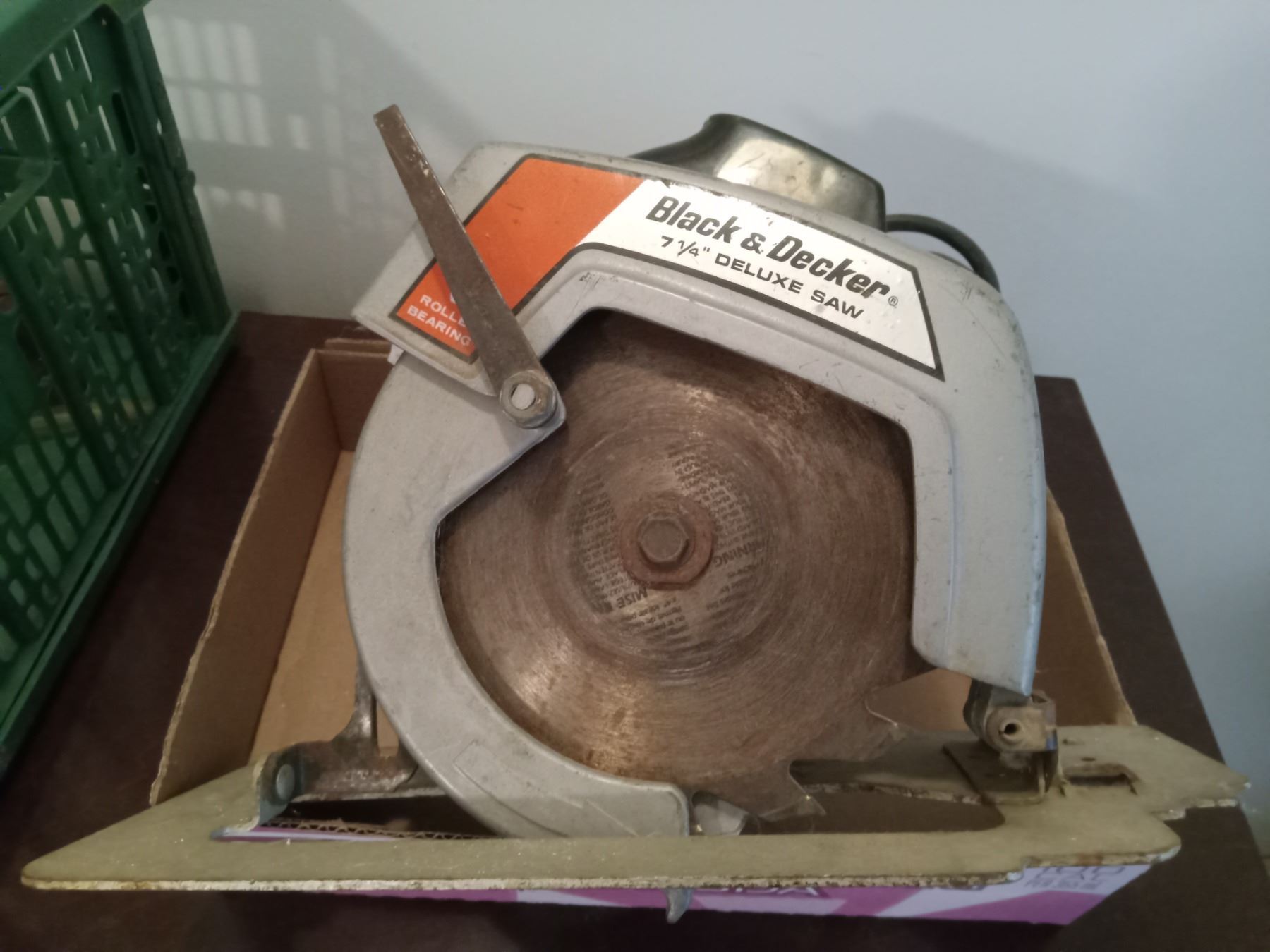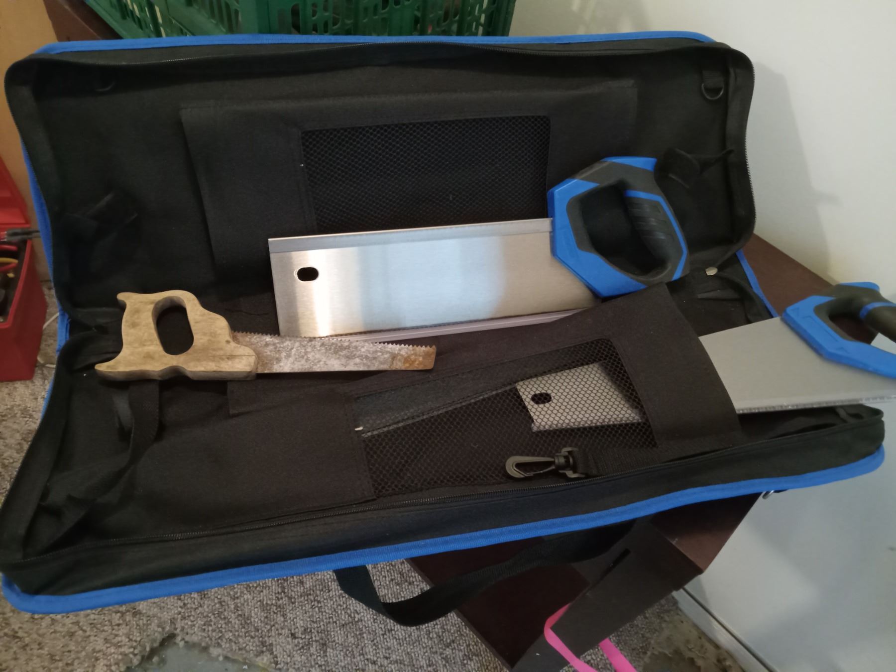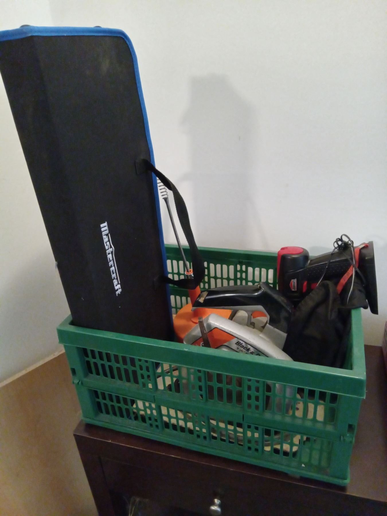 TOOLS: BOX OF SAWS, PLUMBING SNAKE & CORDLESS DRILL