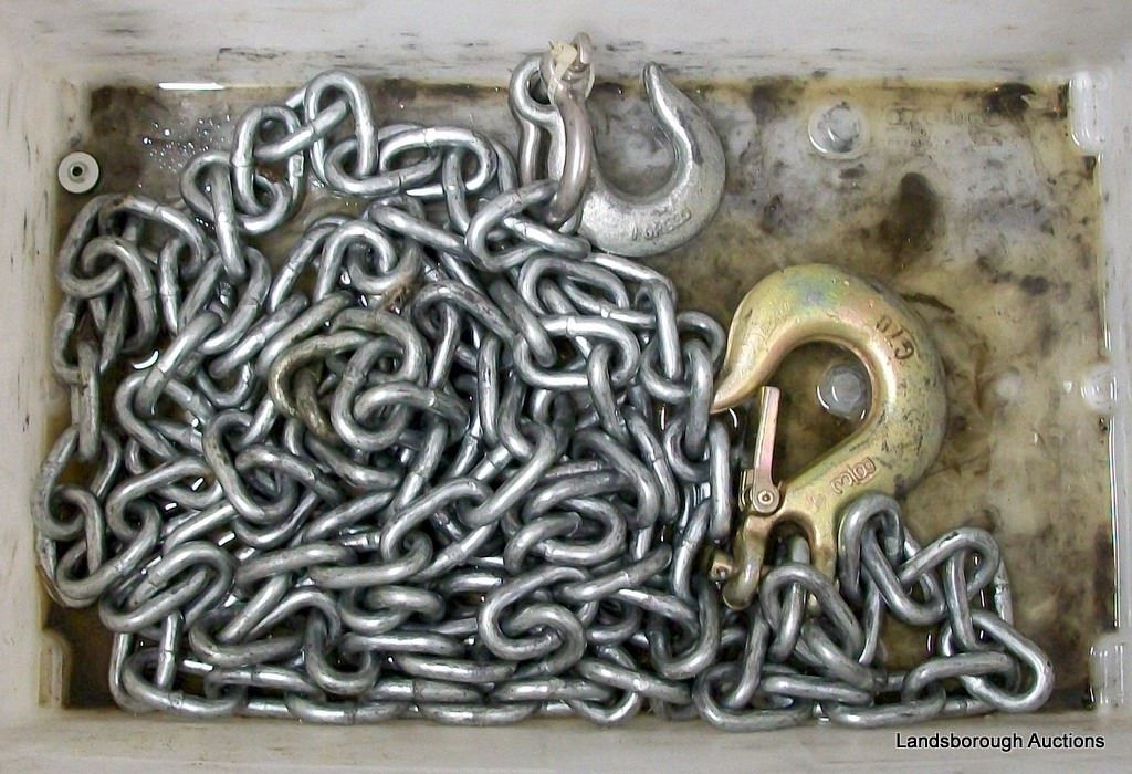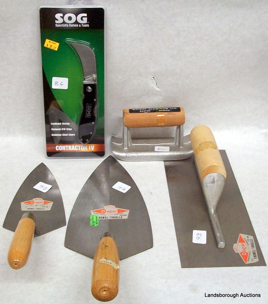 FOUR NEW MASONRY TOOLS, NEW SOG CONTRACTOR KNIFE, LOGGING CHAIN, PALLET PULLER. MUST PICK UP, WILL NOT SHIP.