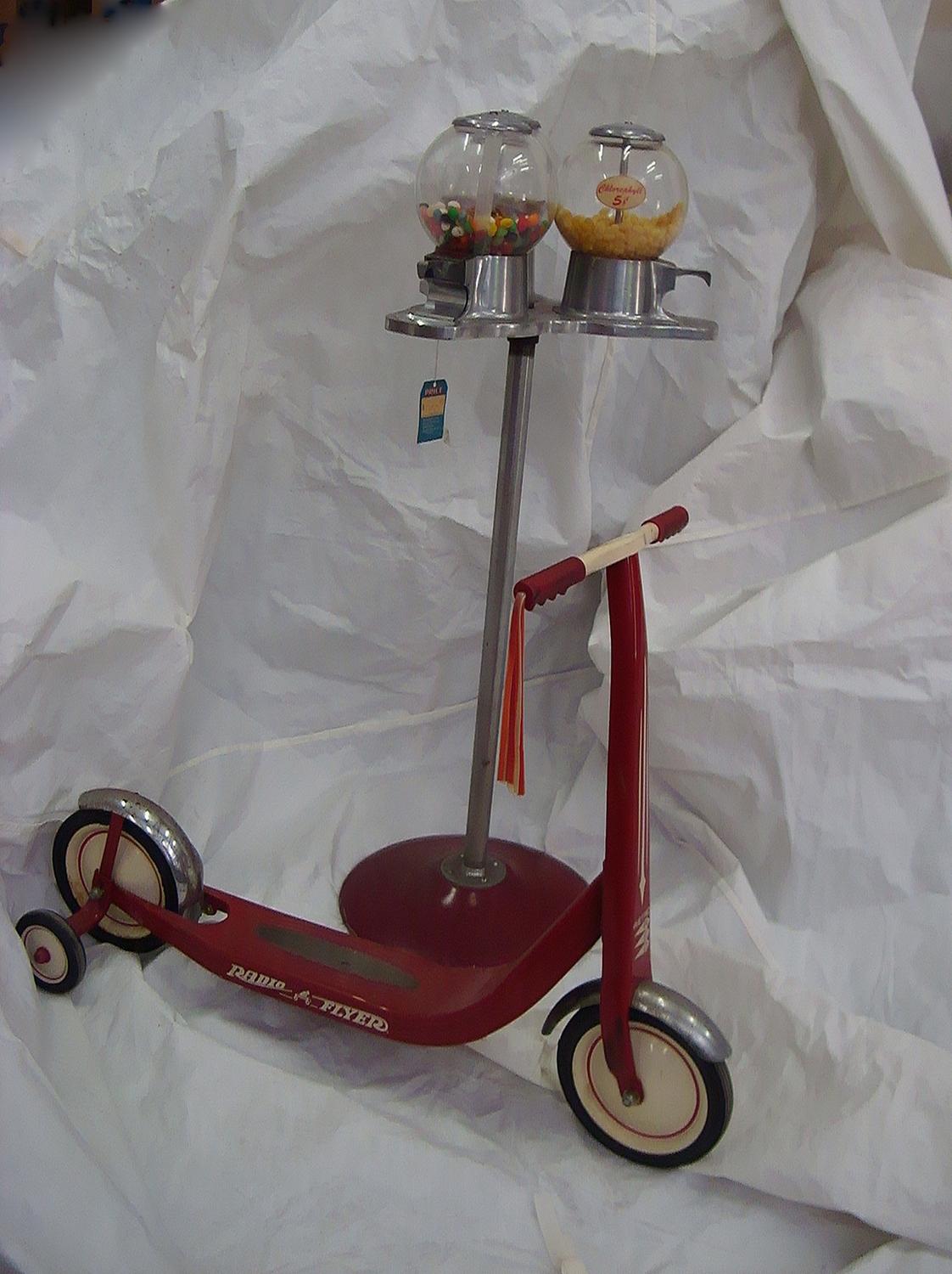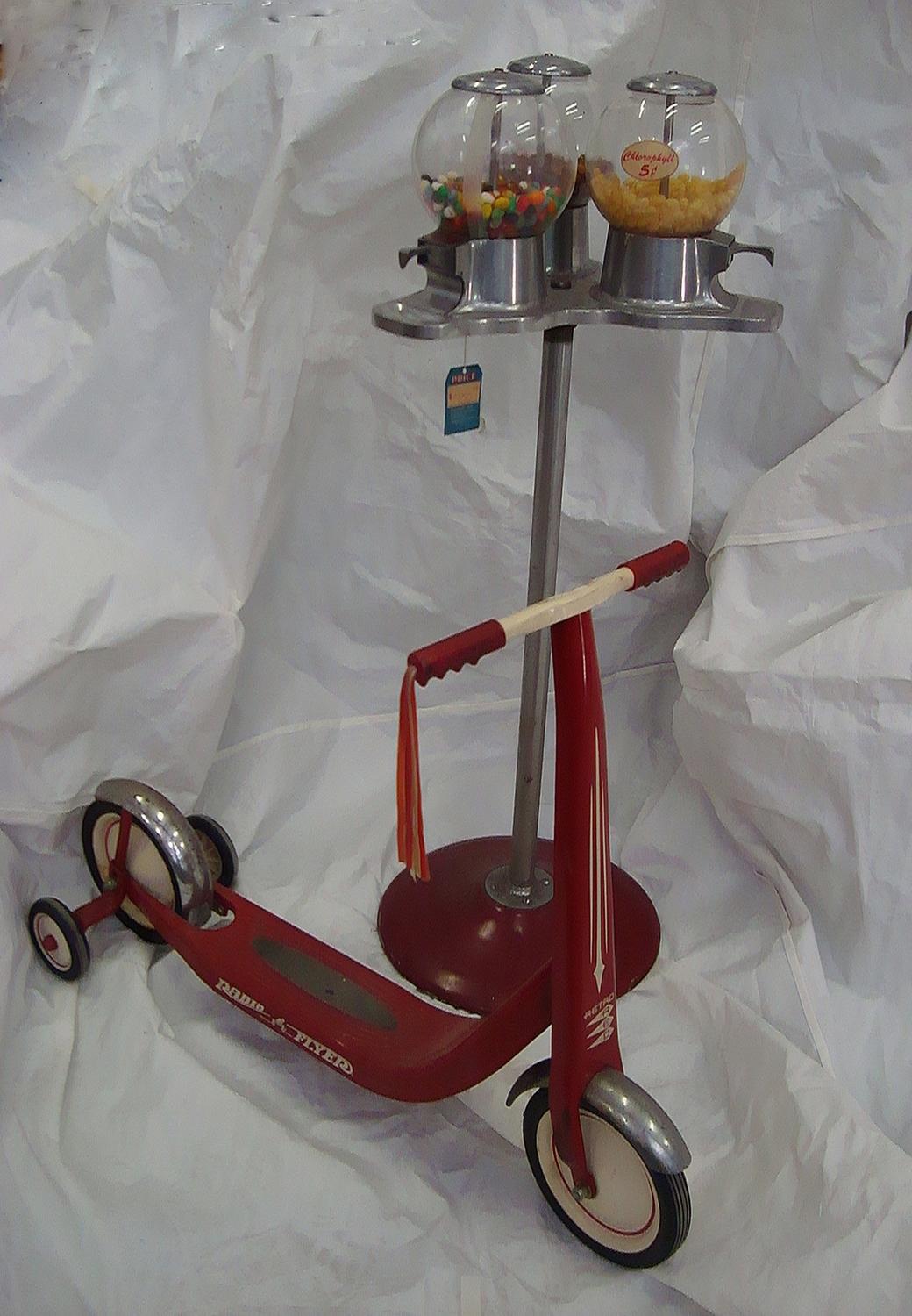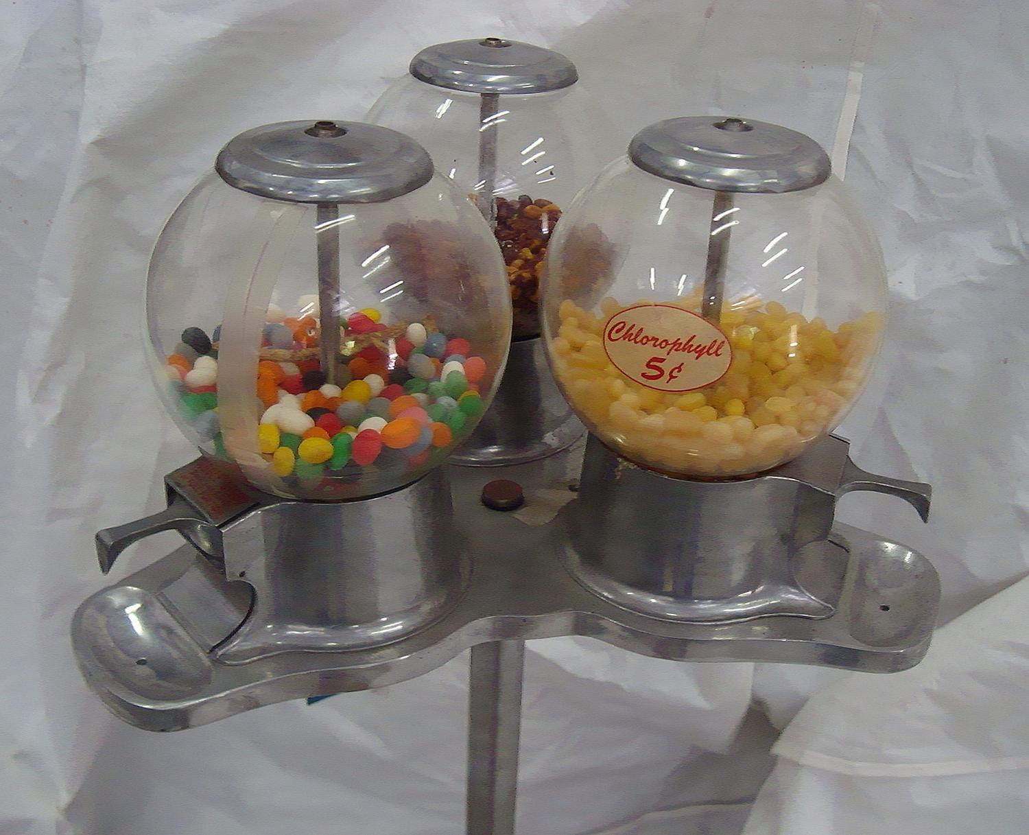 Circa 1950's (3) Globe Gumball Machine with the original candy still intact. As good as things were made in the 1950's before we started to outsource our talents and common sense over-seas, I believe I would lay off eating the candy. Though let me state the machine is awfully sweet!