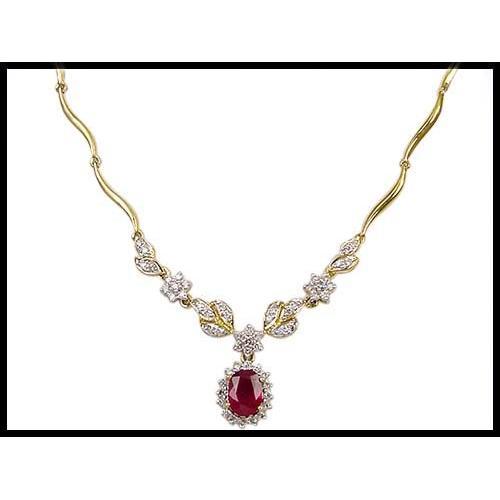 Magnificent is the word to describe this 18K solid gold necklace. A 1.25 yummy red natural ruby is set with 57 diamonds to create candy for the eye, yet priced far below expectations. It measures 16 3/4 inches around the neck, plus the dangle ruby part. It is so elegant, yet simple in design. The $2400.00 tag price represented good value, but own it for just a fraction of that now.