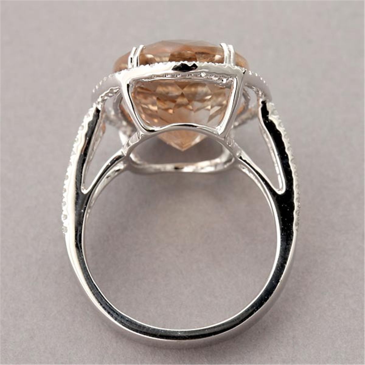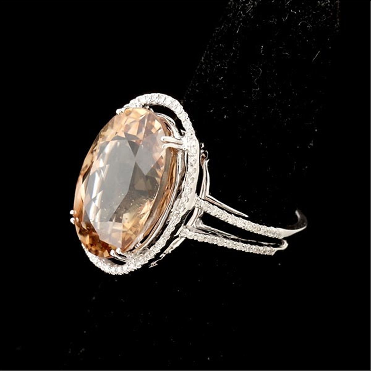 TOPAZ, DIAMOND, 18K WHITE GOLD RING. Centering one oval-cut topaz weighing approximately 16.00 cts., accented by ninety-four round-cut diamonds weighing a total of approximately 0.25 ct., prong and bead set in an 18k white gold mounting. Size 7, 6.10 dwts