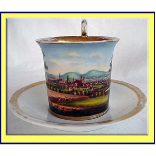 Handpainted German topographic Coffee can / cup and saucer with a named landscape and view of the town of Zittau, with peasants harvesting wheat in the foreground and a very old steam engine train / locomotive chugging along one side. Red roofed houses, churches with steeples clearly depicted in front of a gentle mountain range, under a beautifully handpainted sky. Elegant, scrolling handle with gilded raised foliage bottom and unfurling bud top. Dates to very early 19th century, if not earlier. Saucer is 6 1/2inches in diam. Cup is 4 1/4inches to top of handle.<BR>Handwritten mark underneath Zittau. Gilding on borders is very worn, but no damage. Insignificant superficial glaze/age cracks under the saucer.Painting is pristine.<BR>Zittau is a town near the location of the oldest German porcelain factories such as Meissen.