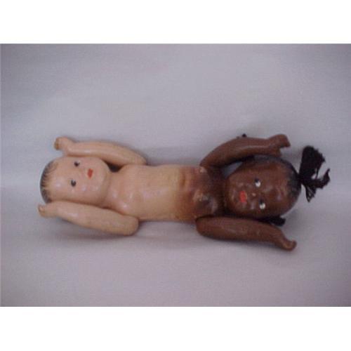 These dolls are shown in a book called "Black Dolls by Myla Perkins 1820-1991 identification and value guide. Price updated in 1995. They are shown on page 90 plate 251. They are dressed in original dress . Both have movable arms. Faces identical except one black and one white. Black doll has turnable head, white one is molded on body. Both have wear on hands with tiny bit of breaking on end of fingers on white doll and a small crack on palm of right hand of black doll. They are original except black dolls string tuffs have been replaced. Black doll has some rub off on her back of neck. If you enlarge pictures these places should show up. If not will send any photos you desire. Please email any questions and allow one day for response. Thank you for looking. Shirl for TAKE ME HOME ANTIQUES & COLLECTIBLES.