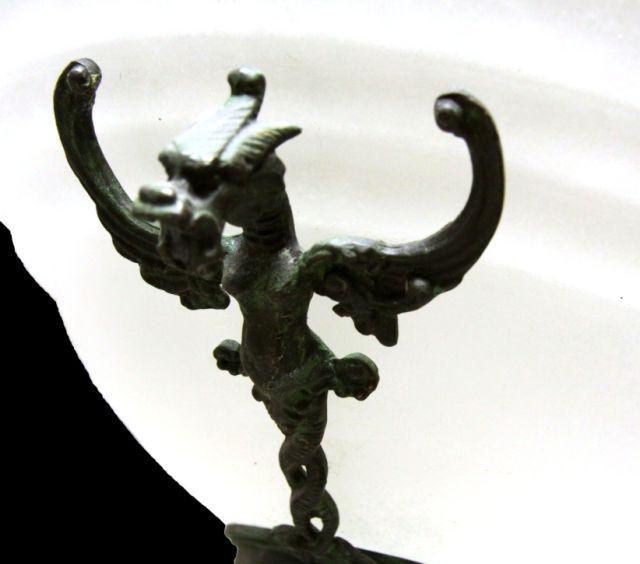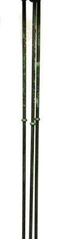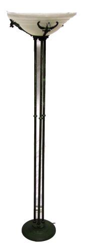 70 inches tall. Three griffins at top with frosted glass globe. Verdigris finish. Foot switch. Single bulb.