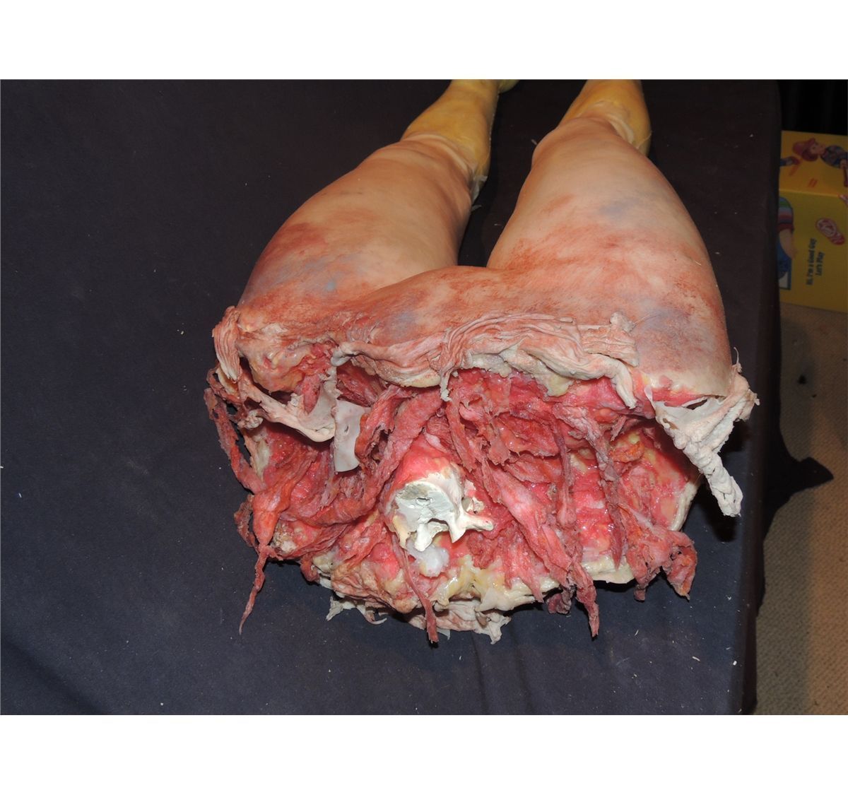 Here is a Silicone on urethane foam lower female torso and legs from a murder victim who was torn in half. Has excellent gore at stump with tattered flesh and spine. Anatomically correct as you can see.