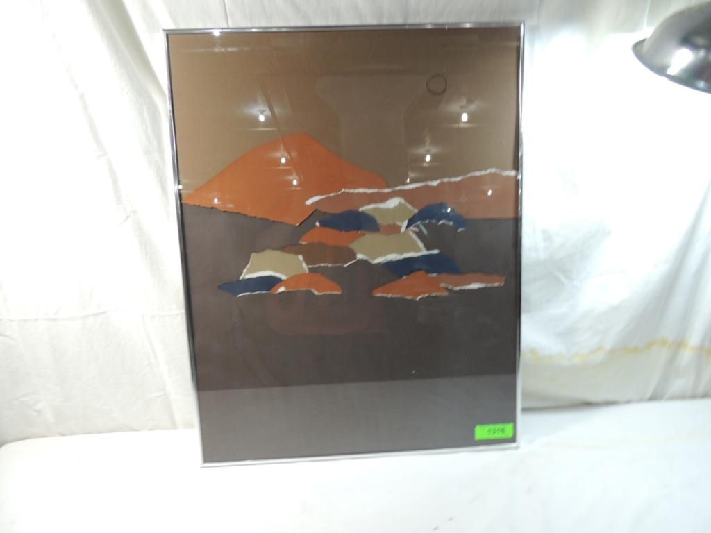 TORN PAPER MODERN ART FRAMED. 22 X 28 MOUNTAINS ART WORK, WALL ART, FRAMED, GALLERY ART, DECORATIVE, AS SHOWN SEE PHOTO FOR MORE DETAILS.