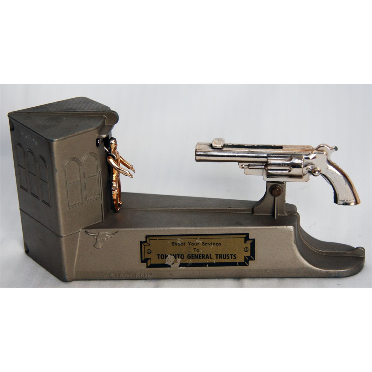 TORONTO GENERAL TRUSTS. Shape of a Gun, Building and Cowboy. A Wild West bank, Gun shots coin into slot over cowboys head. Hole for banknotes on bottom, Key present. Iron, with a two tone gold finish. VF.