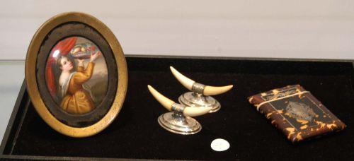 together with a PAIR OF "STEER HORN" KNIFE RESTS and a PAINTED PORCELAIN PLAQUE