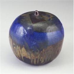 TOSHIKO TAKAEZU spherical stoneware moonpot with exceptional dipped cobalt, mirrored black and umber glazes, with interior rattle. Incised TT. 7 1/2" x 7" $2,500 - 3,500