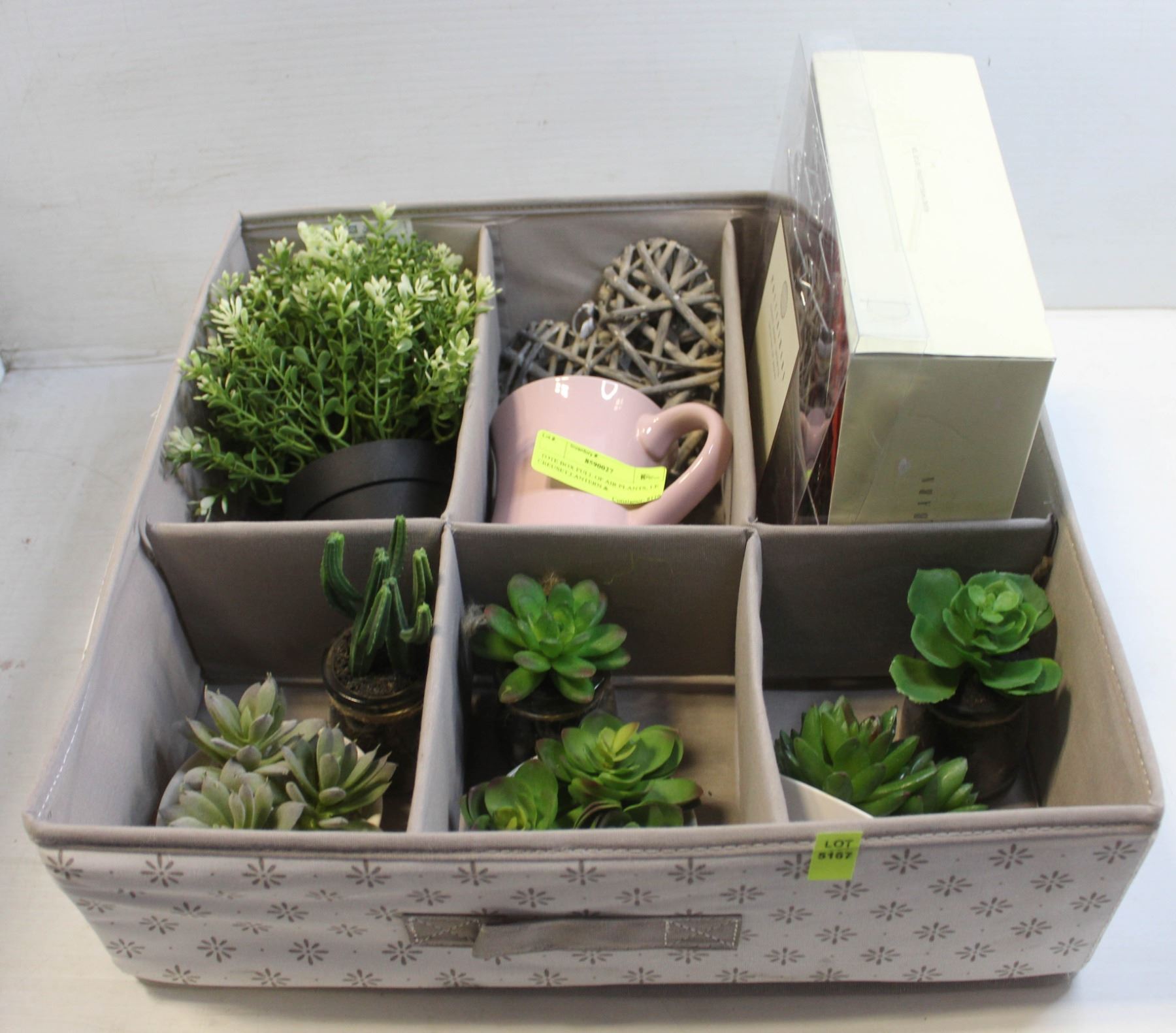 TOTE BOX FULL OF AIR PLANTS, LE CREUSET,LANTERN &