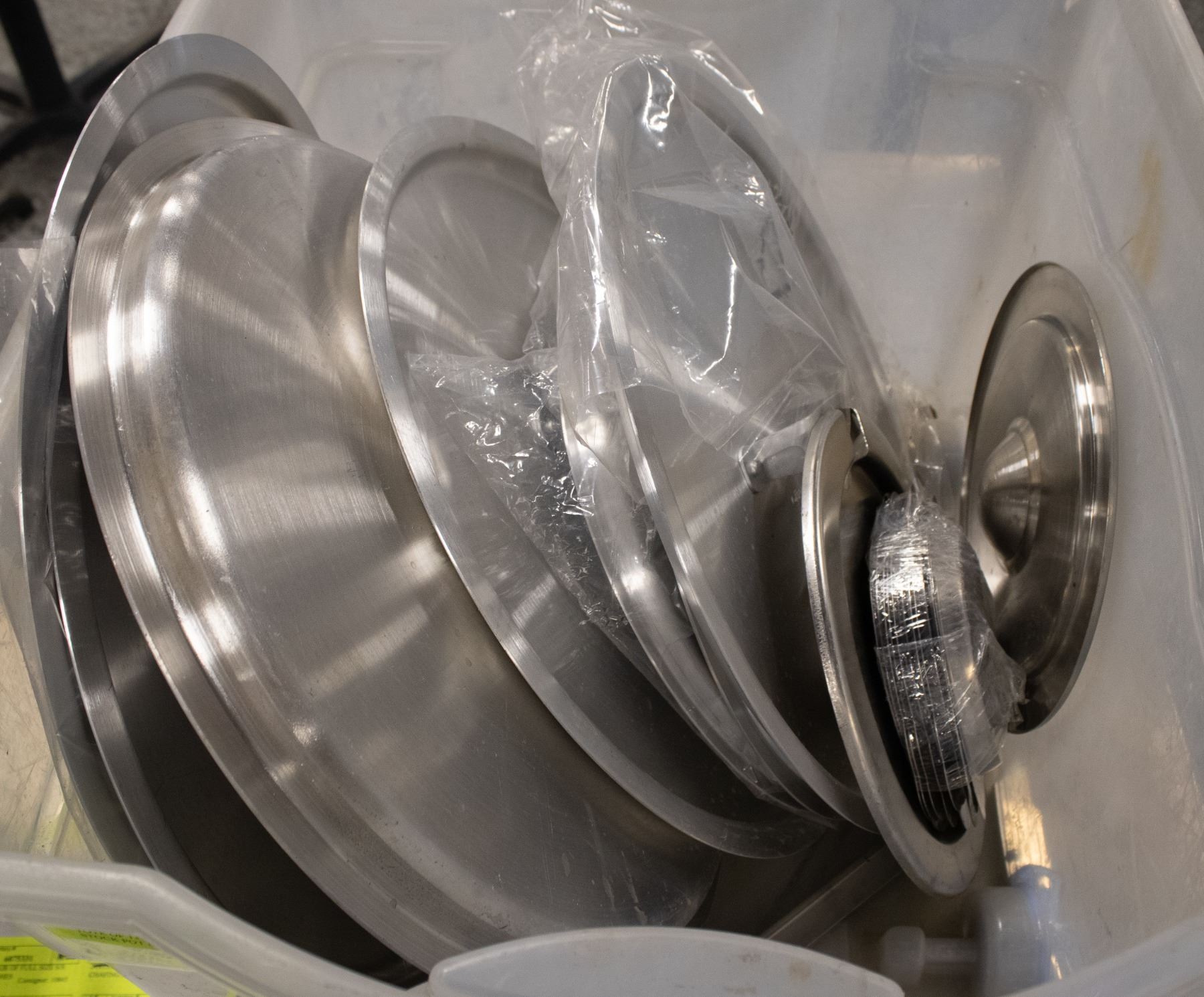 TOTE OF 13 VARIOUS ALUMINUM STOCK POT LIDS