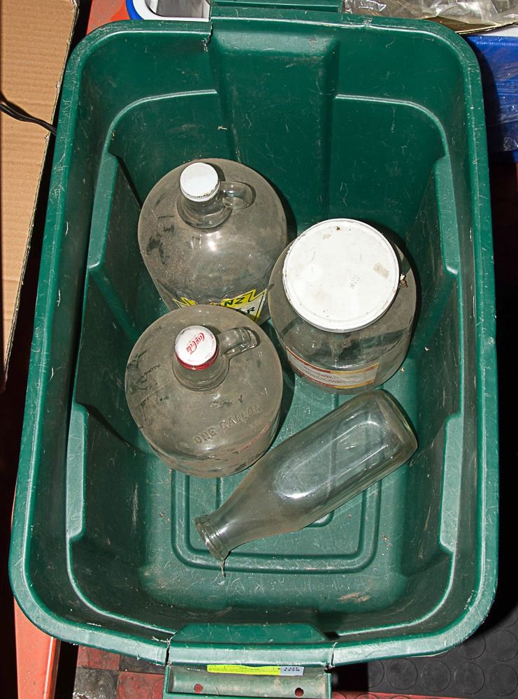 TOTE OF ASSORTED 1 GALLON JUGS & VINTAGE JARS
