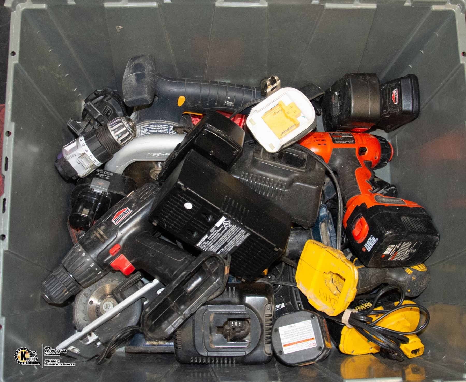 TOTE OF ASSORTED CORDLESS TOOLS/BATTERIES/CHARGERS