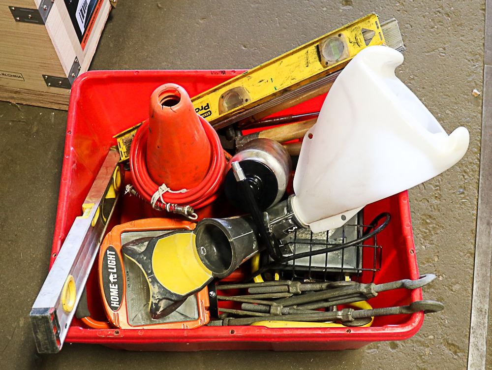 TOTE OF ASSORTED SHOP SUPPLIES AND HARDWARE