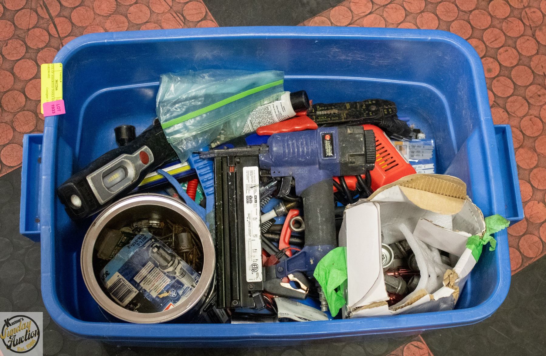 TOTE OF ASSORTED TOOLS AND HARDWARE