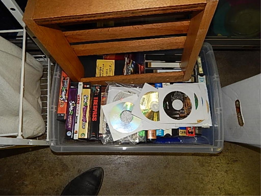 TOTE OF CD'S, GAMES, WOOD WALL RACK