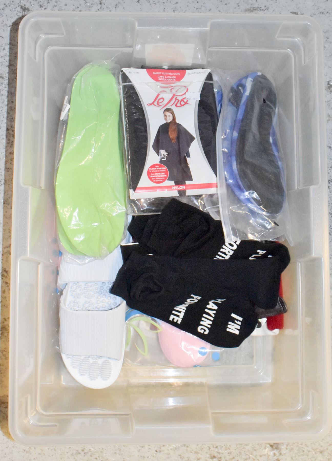 TOTE OF NEW VARIOUS SLIPPERS, SOCKS & MORE