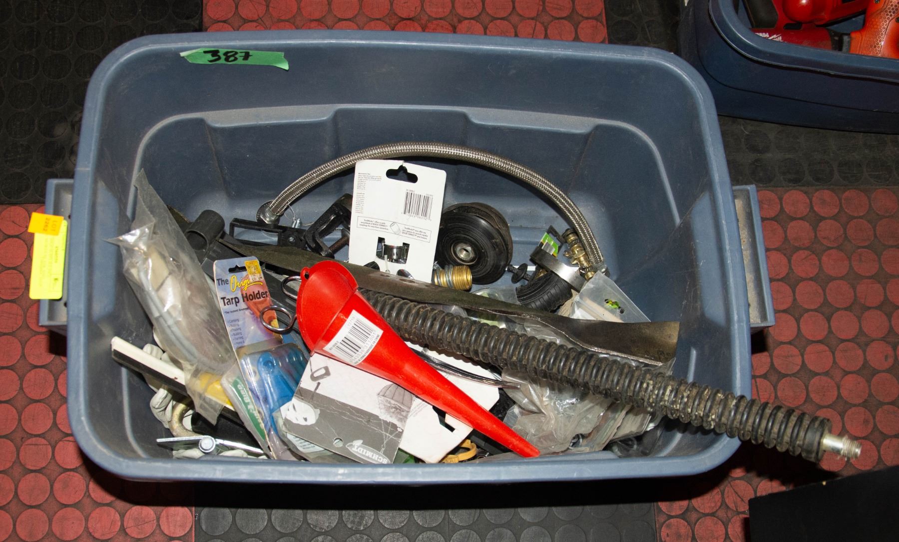 TOTE OF SHOP SUPPLIES INCL CLAMPS, MOWER BLADE AND