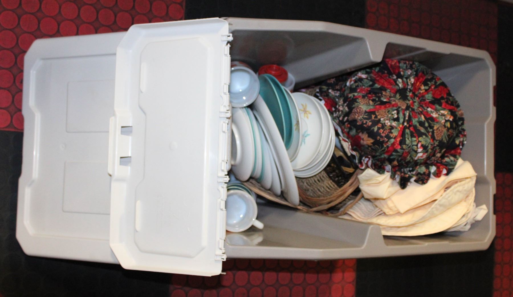 TOTE W/ PLASTIC CAMPING DISHES, SET OF MUGS,