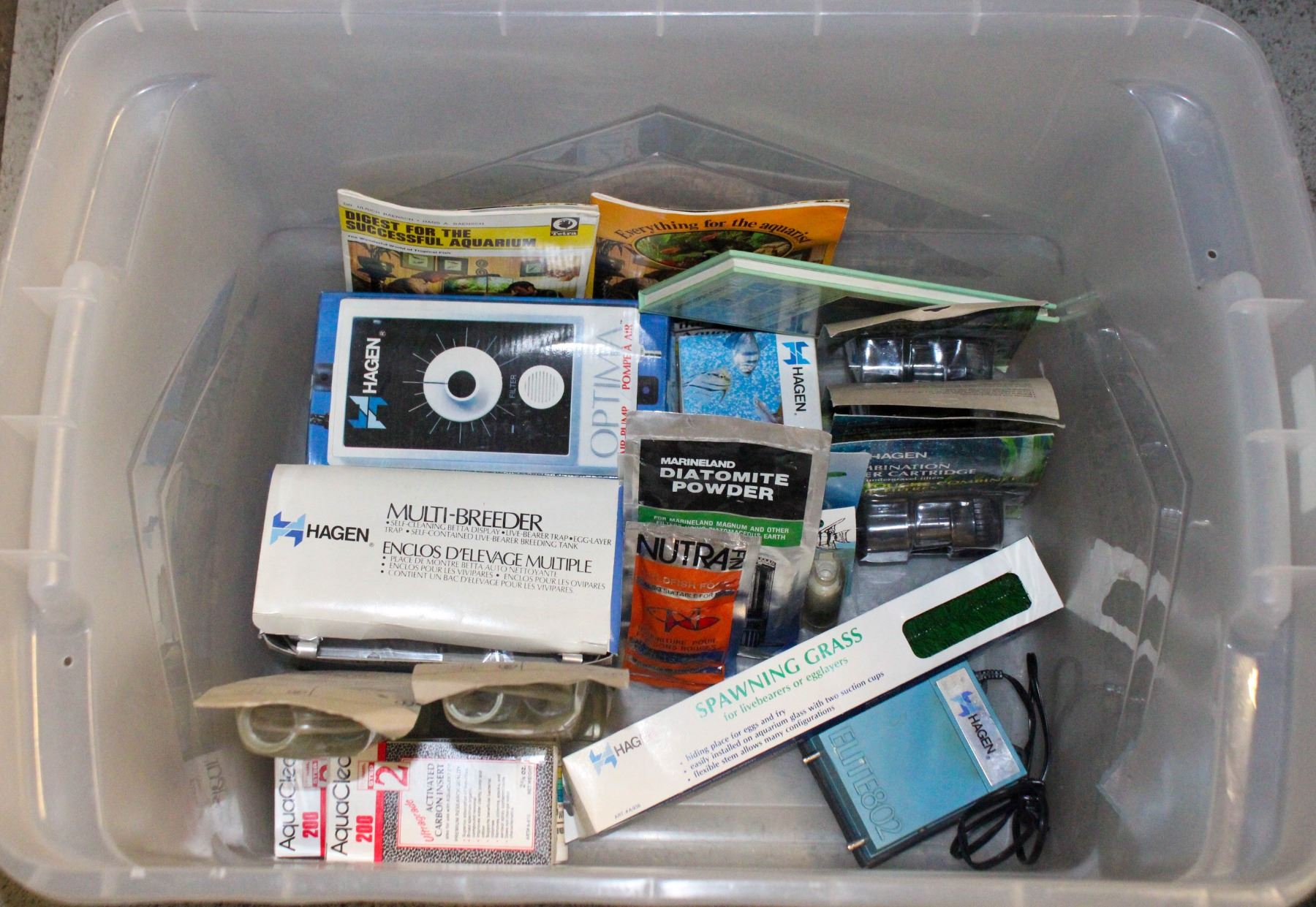 TOTE WITH ASSORTED AQUARIUM ACCESSORIES