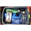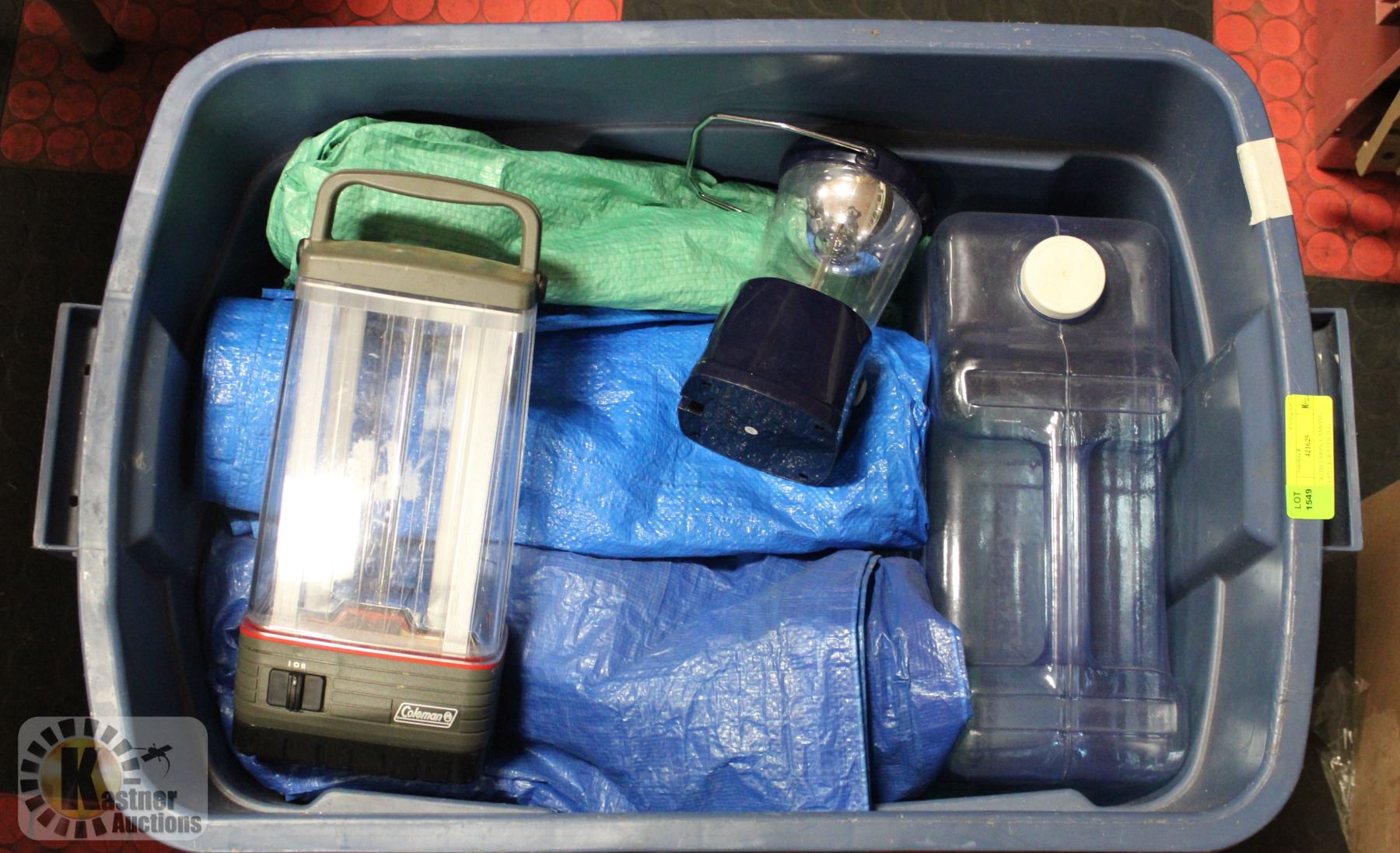 TOTE WITH TARPS, CAMPING LANTERNS & WATER JUG