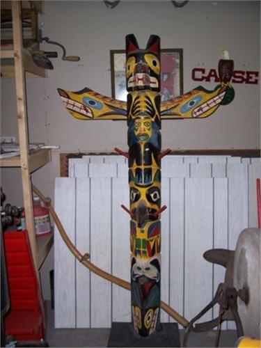 TOTEM POLE- THIS IS SELLING AT AUCTION IN OSLO, MN 10-15-05. IT WAS AQUIRED FROM ALASKA ON A FISHING TRIP- YEAR UNKOWN. CONDITION IS ORIGINAL- IT HAS MANY BIRDS AND BRIGHT COLORS. IT HAS HAD REPAIRS DONE TO THE BEAKS ON SOME BIRDS. IT IS 6-7 FEET TALL. UNSURE OF AGE AND ORIGIN. SELLING AS-IS