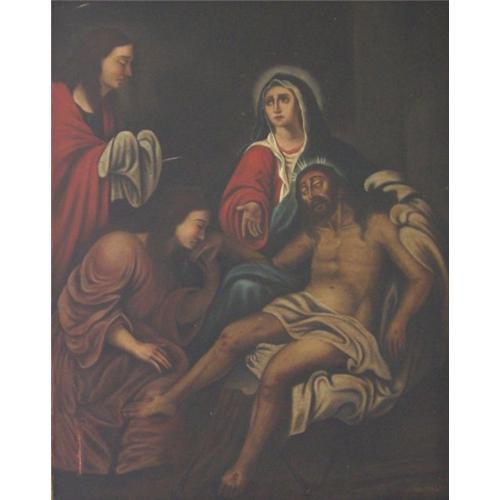 Description: TOUCHING DEAD PITY ON CHRIST. Striking and touching holy scene in which Christ, just deposed by the cross, lies lifeless between his mother's arms. The body is not stiffened yet by the rigor mortis, however causes the pain signs: the inflated and closed eyes seem two inflated almonds, and the pale face seems strike, almost prick the sensitivity of who looks at him, also aureole, compotes from rays tends to point out to highlight the composition sentimentalism, almost pathetics. Christ's body lies lain down in arm to his mother than with the hand right shows the son's lifeless body and raises the eyes to the sky. The woman, upset in the soul, shows a lying face, almost serene, if it was not for some imperceptible signs wanted by artist who show to his pain: the tightened young woman's lips, the big eyes, polish for the tears, turn to the council sky, and say the mystical acknowledgement of her destiny, which shows all of hurt?s weight, although just known.