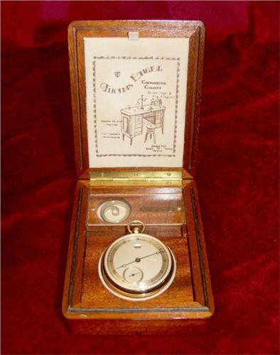 TOURBILLON CHRONOMETRE en or 18 cts, signé THOMAS ENGEL No 3. Cadran en métal argenté guilloché, à 12 heures, guichet pour la réserve de marche 40 heures, arrêtage avec système croix de Malte, aiguilles Breguet en acier bleui, petite seconde entre 6 et 7 heures. Boîte guillochée, fond vissé et double fond. Lunette avec verre. Poids total 175 gr. Certificat délivré à La Chaux-de-Fonds le 5 juillet 1982. Avec sa boîte d'origine