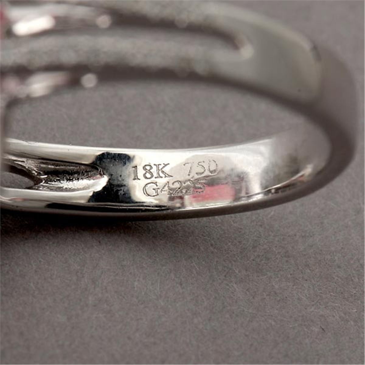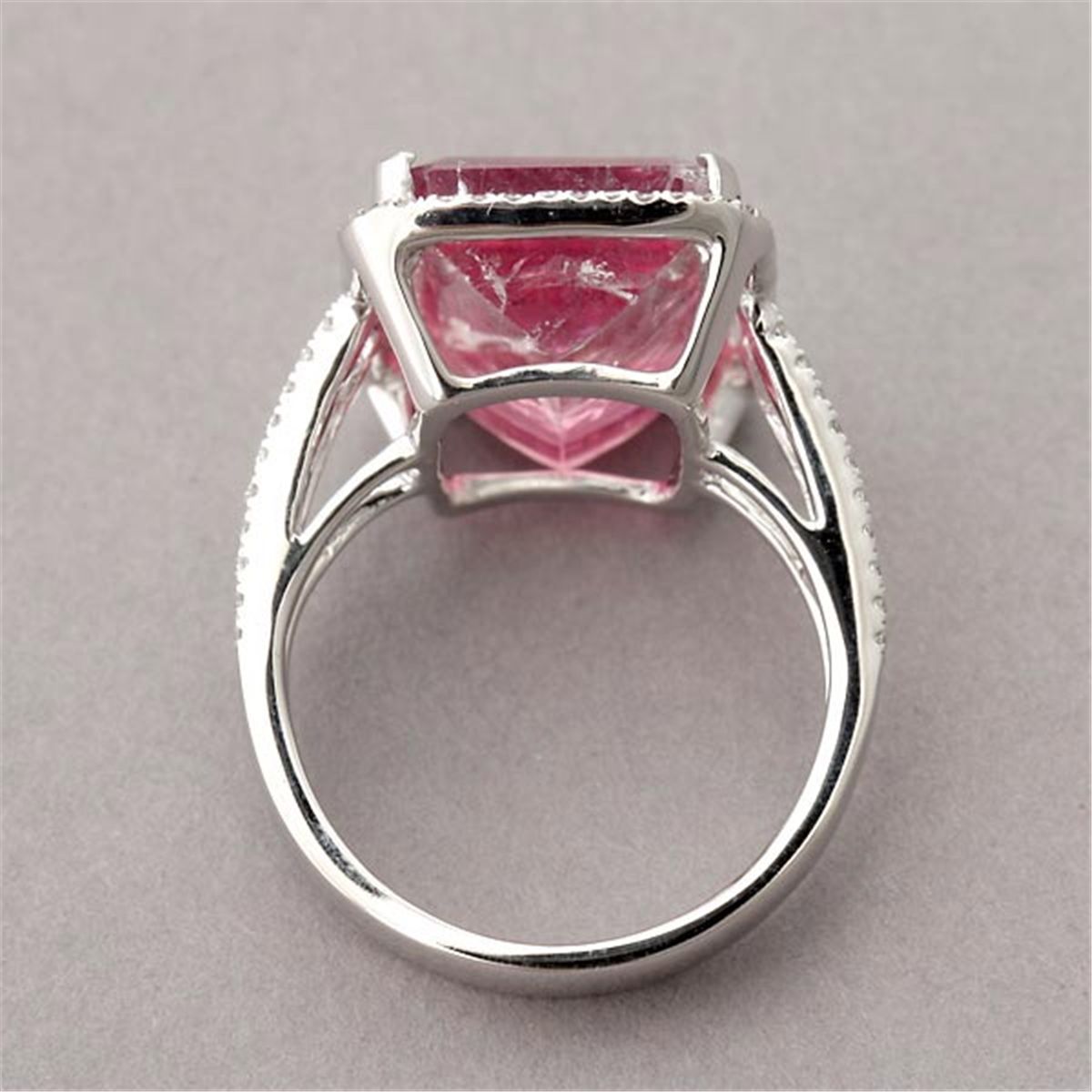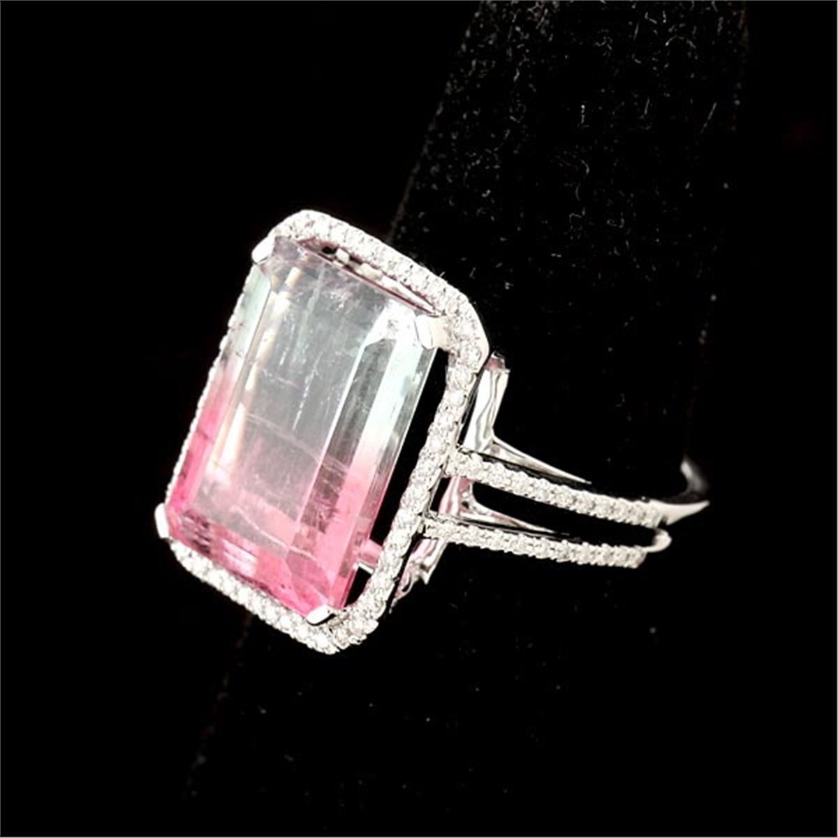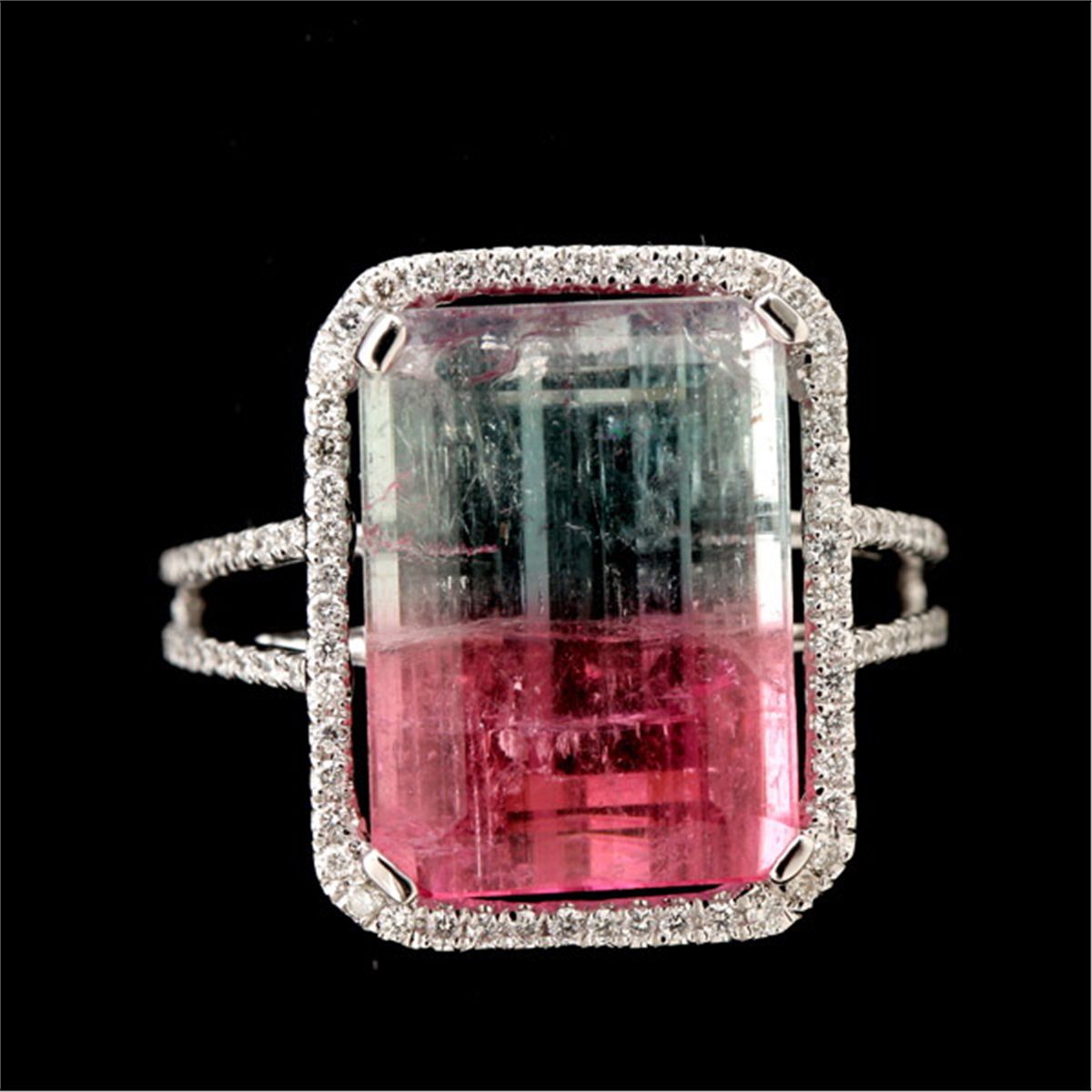 TOURMALINE, DIAMOND, 18K WHITE GOLD RING. Centering one emerald-cut party color tourmaline, weighing approximately 11.60 cts., accented by ninety round-cut diamonds weighing a total of approximately 0.30 ct., prong and bead set in an 18k white gold mounting. Size 7, 5.20 dwts