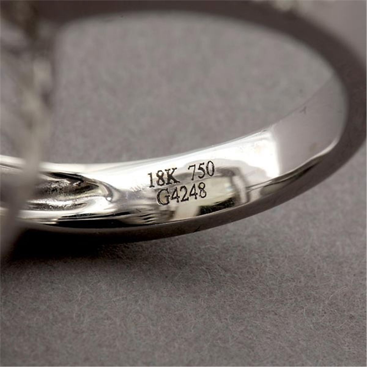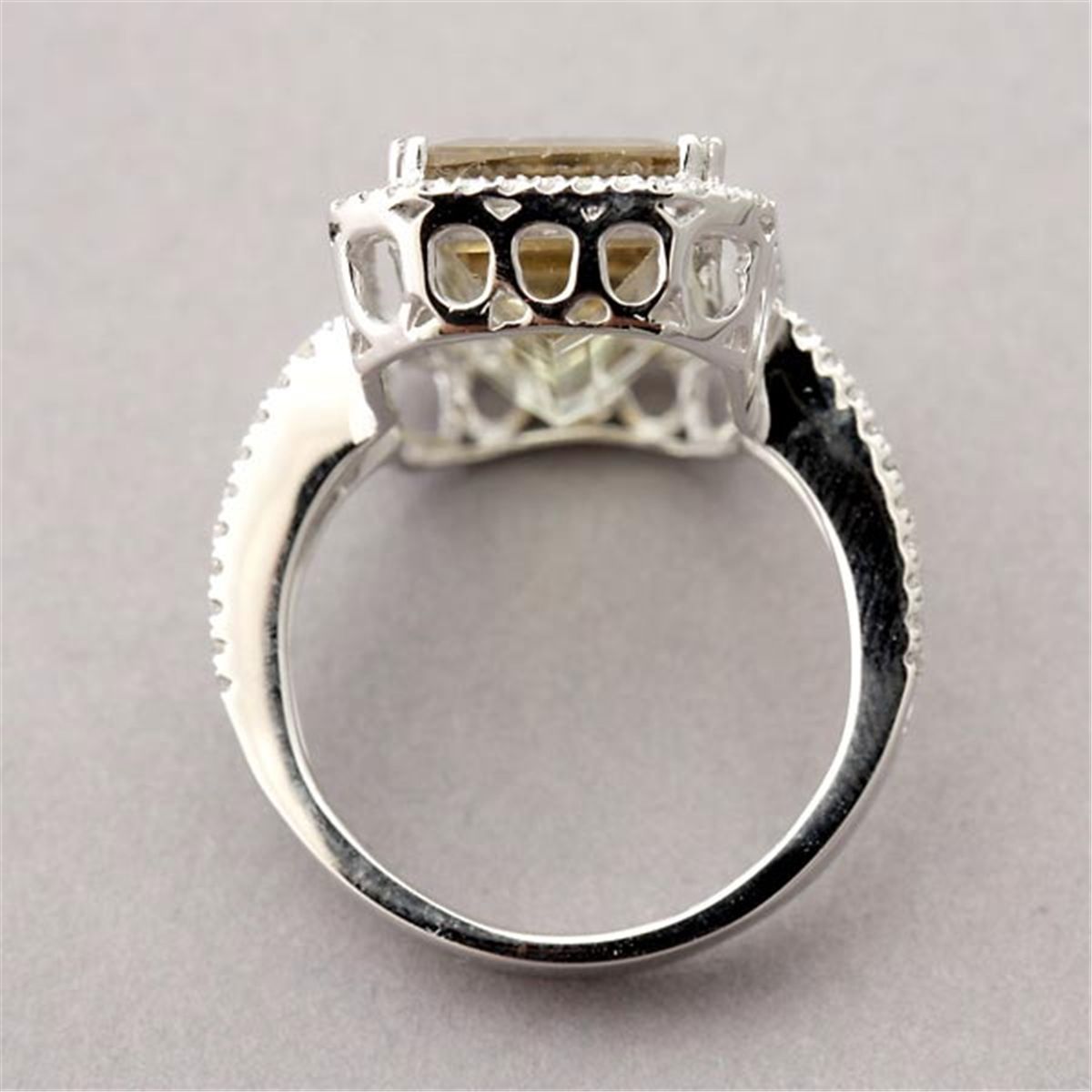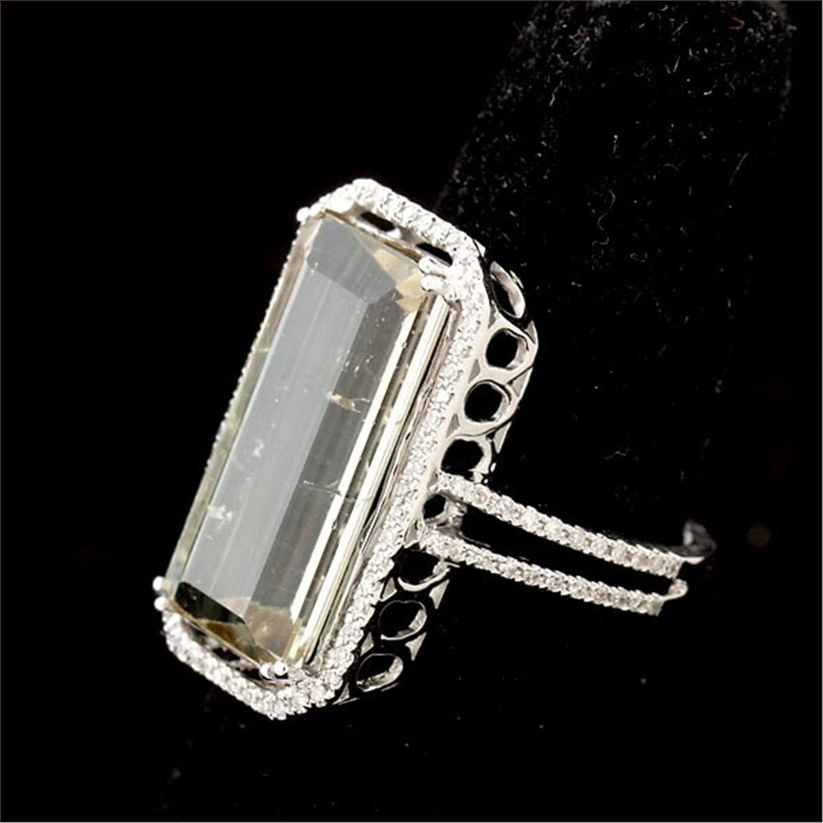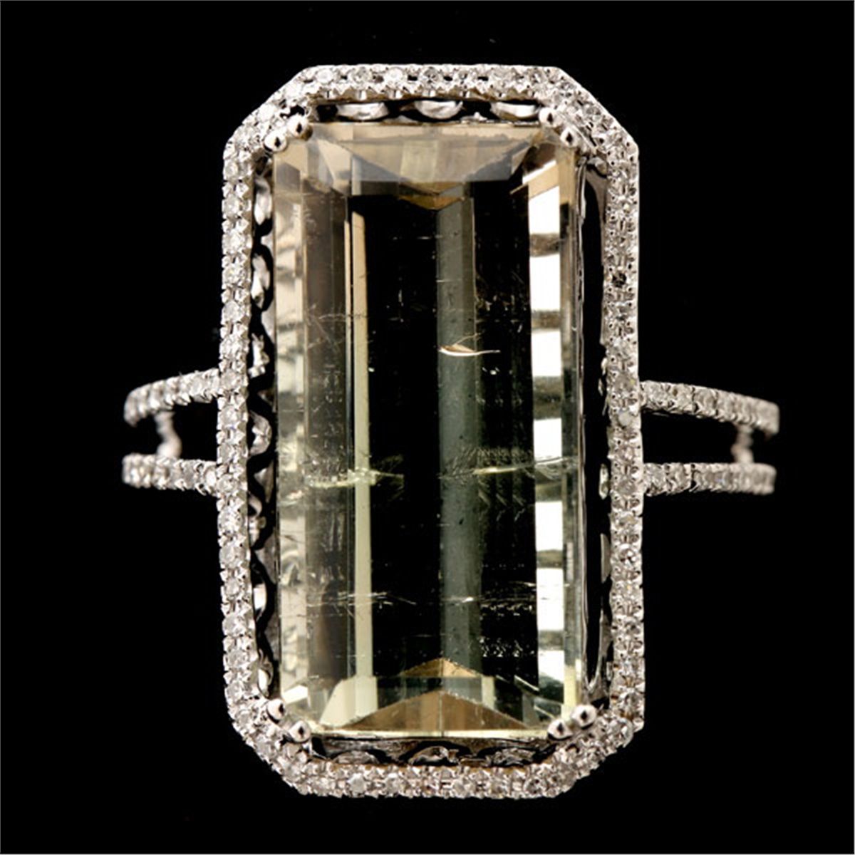 TOURMALINE, DIAMOND, 18K WHITE GOLD RING. Centering one emerald-cut tourmaline, weighing approximately 11.50 cts., accented by one hundred and two round-cut diamonds weighing a total of approximately 0.25 ct., prong and bead set in a 18k white gold mounting. Size 7, 5.30 dwts