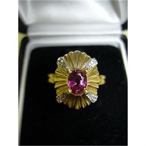 THIS RING IS QUITE CHARMING WITH THE CENTER OVAL PURPLE TOURMALINE ON THE TOP DECORATED WITH 4 STRIPES OF SMALL DIAMONDS.