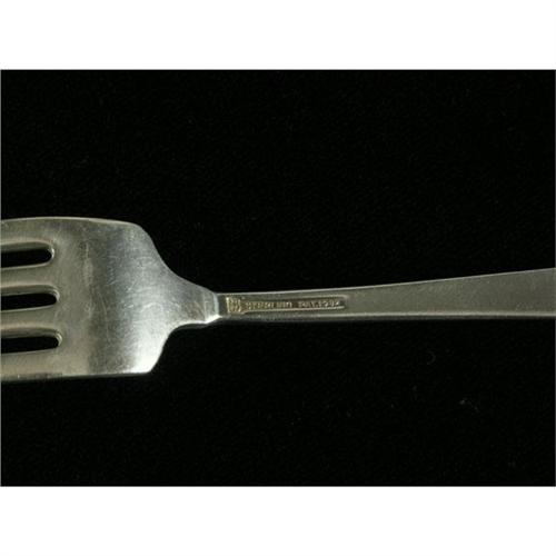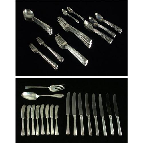 STERLING: A lot of hallmarked Towle Sterling Silver, pattern ''Craftsman'', 1932, monogrammed ''H'', consisting of the following, 8 French hollow knives 8.75'' (all rounded to quarter mark), 8 dinner forks 7.25'', 8 salad forks 6.5'', 8 oyster/cocktail forks 5.75'', 8 flat handled butter spreaders 5.75'', 8 teaspoons 6'', 8 fruit or orange spoons 5.75'', 8 cream soup spoons 6.50'', 6 demitasse spoons 4.25'', 1 vegetable serving spoon 8.25'', 1 vegetable serving fork 7.35''. Note: Set reflects extended use, some pitting and discoloration.