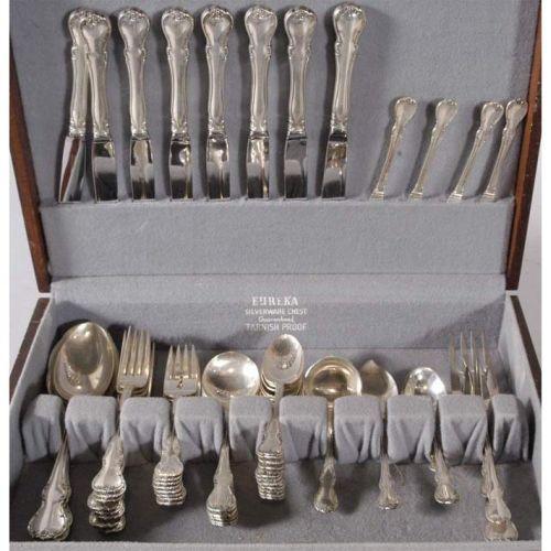 TOWLE "FRENCH PROVINCIAL" PARTIAL STERLING FLATWARE SET 58 pieces with no monogram, 1754 grams excluding knives. Consisting of: 8 knives (8 3/4"), 6 butter knives (5 3/4"), 8 dinner forks (7"), 8 salad forks (6 1/2"), 6 soup spoons (6 1/4"), 12 spoons (6"), 3 serving spoons (1-8" and 2- 8 1/2"), 3 serving forks, 1 serving knife, 1 pick.