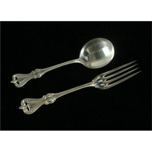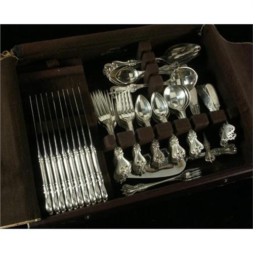 STERLING: An 86-piece lot of sterling silver flatware hallmarked Towle Sterling. The pieces are stamped with the shield of ''Towle Sterling'', ''Old Colonial'', dates from 1895, and remains one of the most popular flatware patterns today. The set includes the following, 10 modern hollow dinner Knives, S/S blade 8.75'', 10 luncheon forks 7'', 10 salad forks 6.25'', 20 teaspoons 5.5'', 10 oval cream soup spoons, 6'', 10 flat butter spreaders 5.75'', 1 master flat butter knife 7.25'', 2 cocktail forks 6.25'', 1 gravy ladle 7.5'', 4 serving tablespoons 8.5'', 4 oval dessert spoons 7'', 1 pie server 10'', 1 cold meat fork 7.75'', 1 jelly spoon 6'' (sizes rounded to nearest quarter inch), includes a felt lined zipper storage box, 109.47ozt excluding s/s knives and pie server, condition reflects careful use with no damage noted on any pieces.
