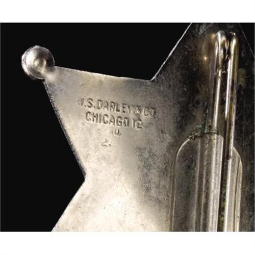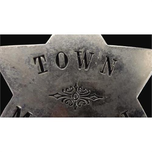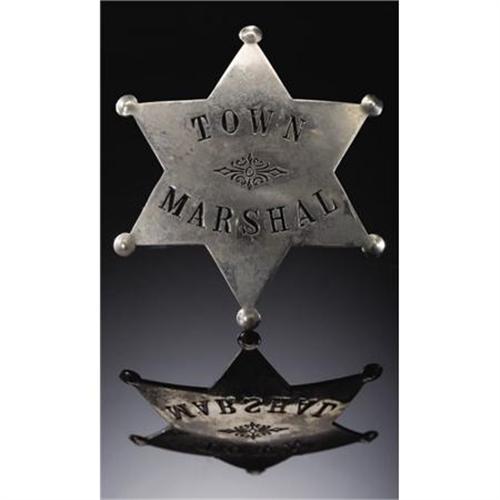 <B>TOWN MARSHAL STOCK BADGE CIRCA 1900-15</B></I> - A rare example of the Town Marshal stock badge title, which typically denoted the Chief of Police for a smaller community. The term “Marshal” was replaced by the notation “Chief of Police” on the majority of badges by the year 1920, but the job description remained the same. This Town Marshall badge has a classic look and a scarce title.<I> From The George Jackson Collection.</B></I><BR><BR><b>Shipping:</b> Miscellaneous Collectibles, Smal (<a target="_blank" href="http://www.heritageauctions.com/common/shipping.php">view shipping information</a>)