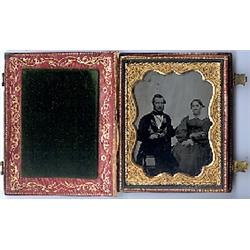 The scene is European. The inside cover has lovely gold tooled red leather with a green velvet rectangle attached.  Contains a rich ambrotype of a couple [4-]. Not listed, though the 1/6 plate 6 – 127 (p. 454) is similar in conception. A beautiful treasure.