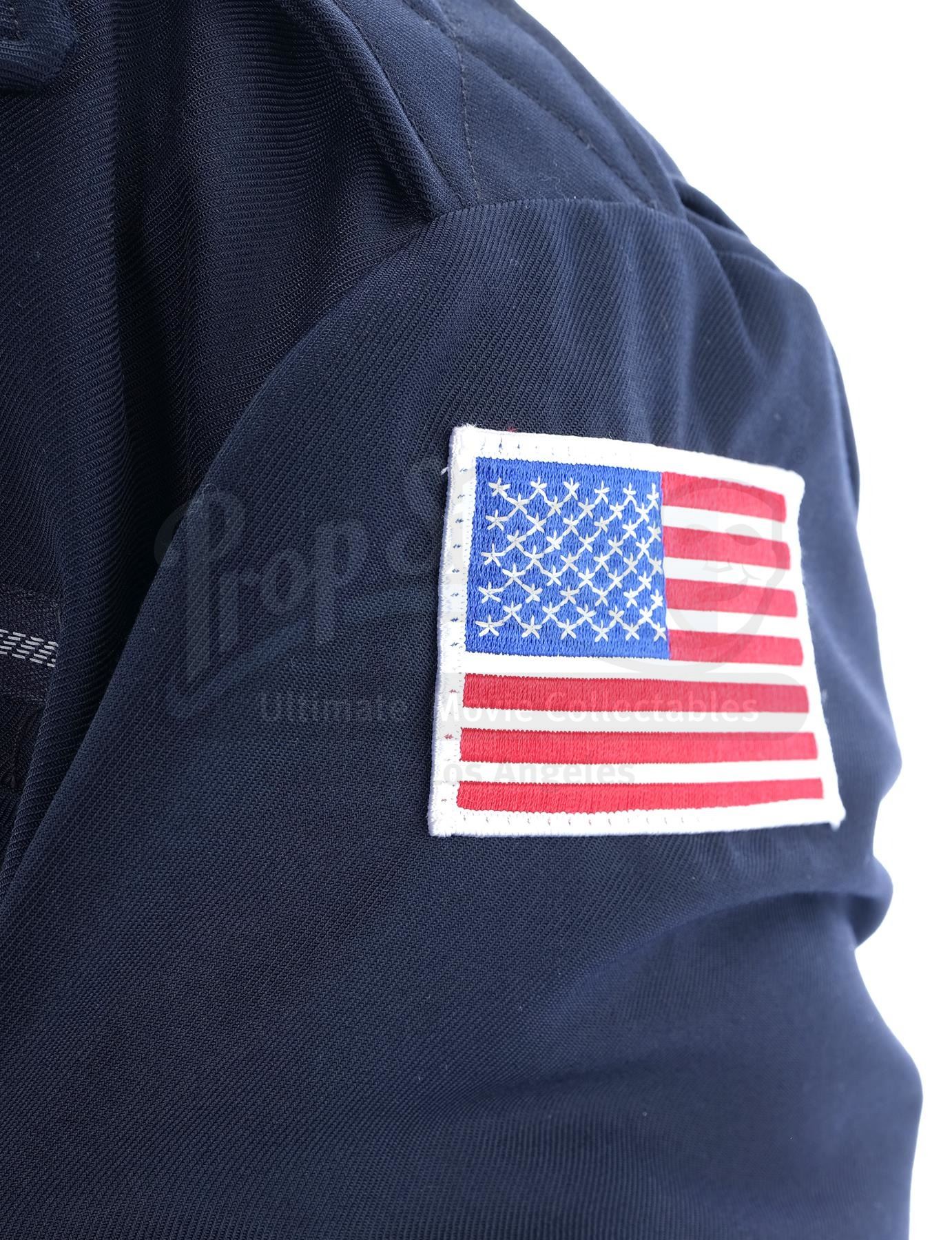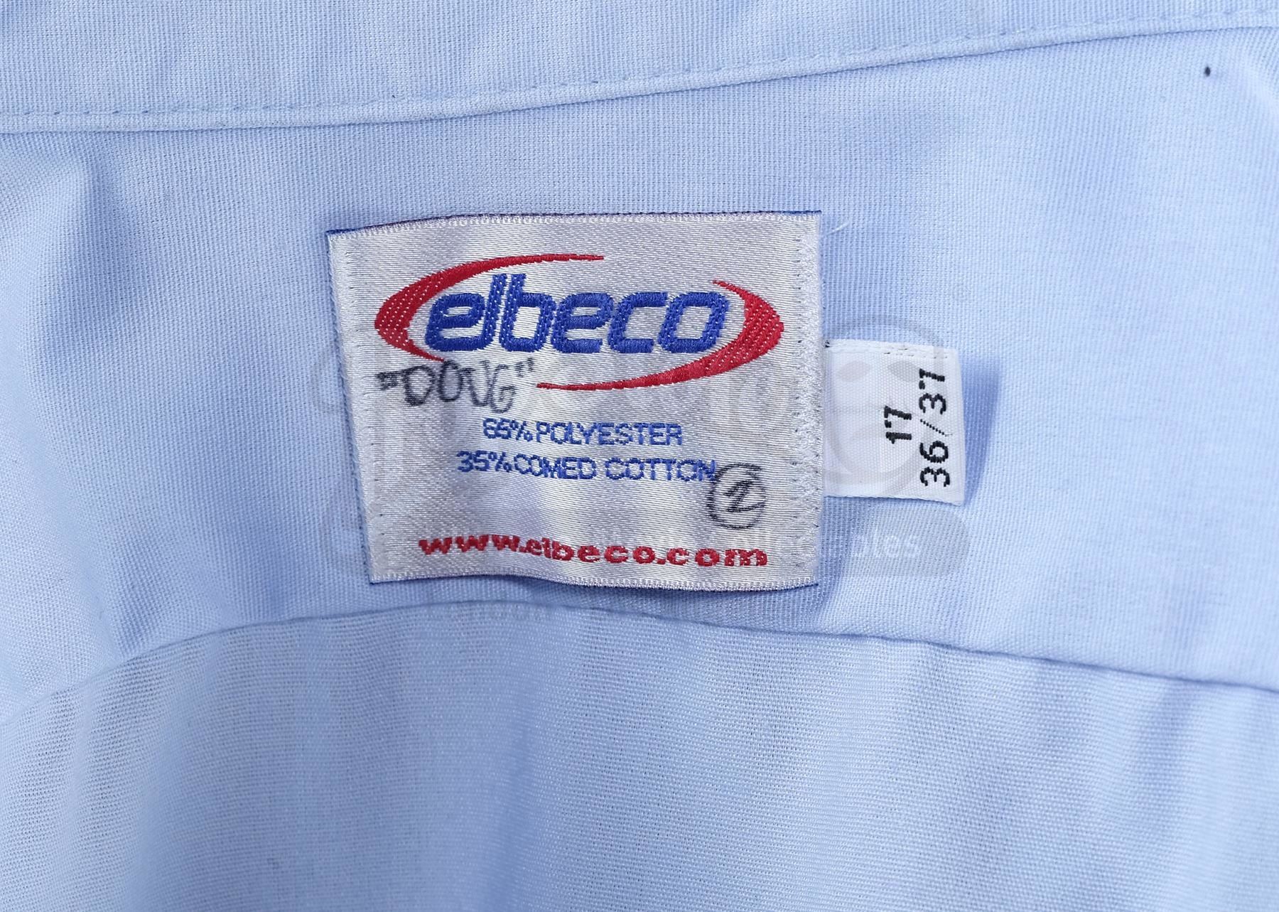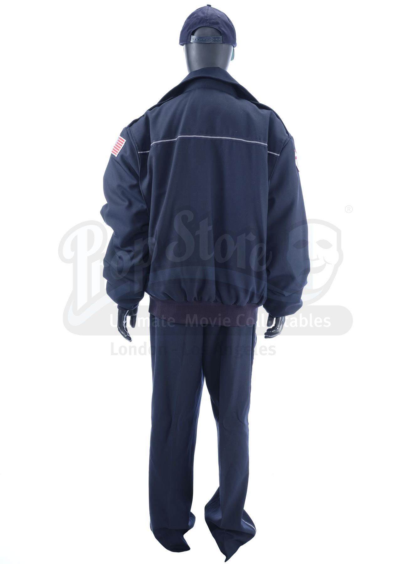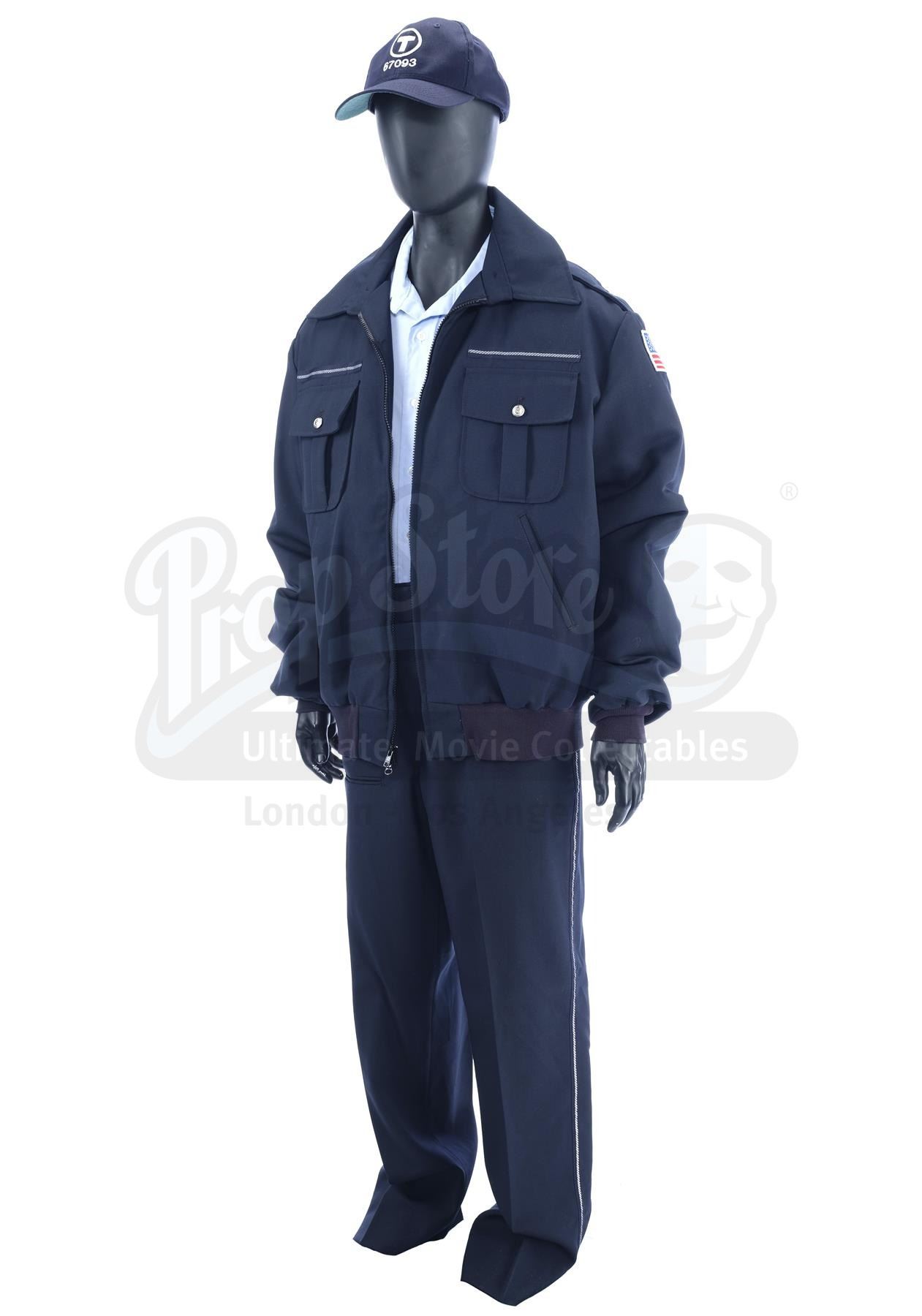 This costume consists of a navy-coloured jacket with a pair of patches; a light blue short-sleeved button-up shirt with a pair of patches, labelled "DOUG" on the interior; a pair of navy-coloured trousers; and a navy baseball cap with a patch and the number "67093" embossed on the front. There is some mild staining on the jacket and fraying on the lettering on the baseball hat.