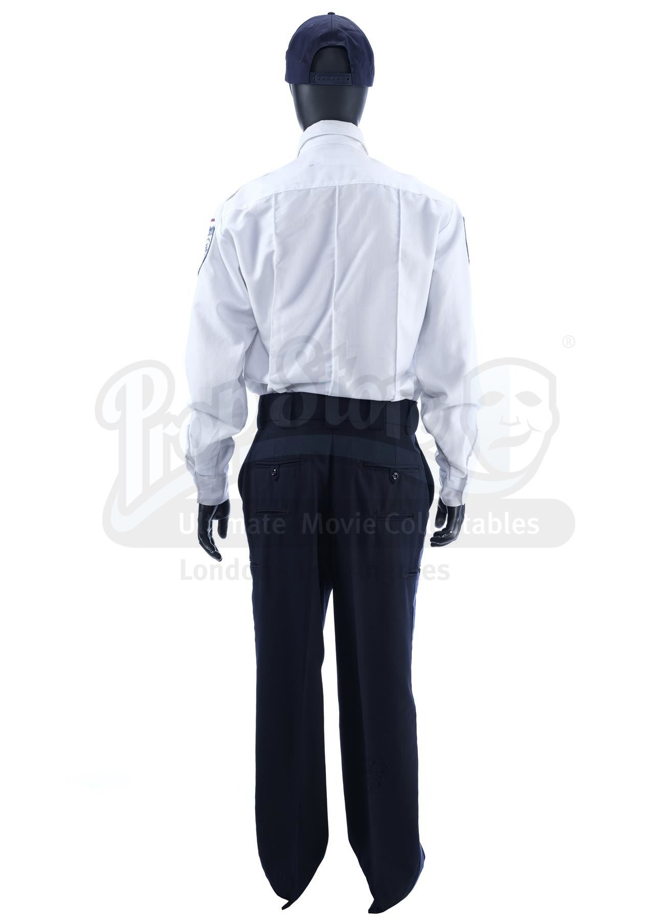 This costume consists of a long-sleeved white shirt labelled "JEM" on the interior, with three EMT patches and some small faux bloodstains on the front; a pair of navy-coloured trousers; and a navy-coloured hat labelled "J" on the interior, with an EMT patch embossed on the front. There is some mild discolouration on the shirt.