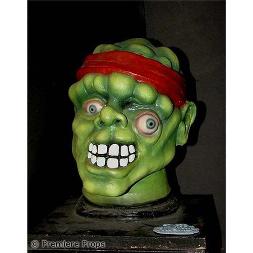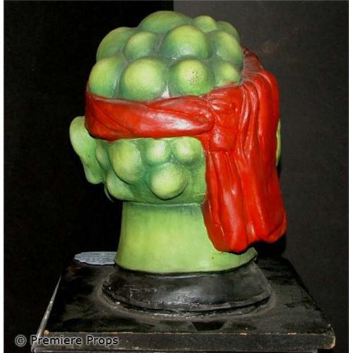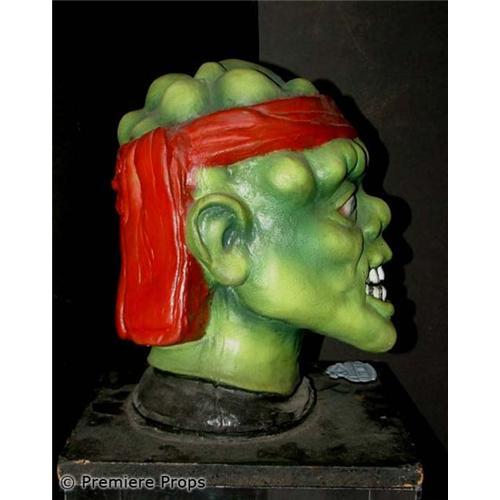 VERY RARE - A BUST OF ORIGINAL DESIGN FOR TOXIC AVENGER IN “THE TOXIC CRUSADERS” 1990-1991. Mounted on wooden base 12’ x 12’ with commemorative TROMA plaque. Molded latex. 13” in height. This is a very unusual piece - a TOXIE bust with a bandana that never made it into the show. (TRO2016)