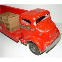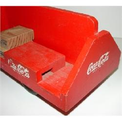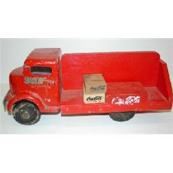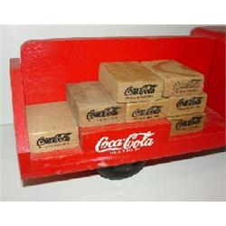 TOY COCA-COLA TRUCK. Wooden body and metal cab. Doors are labeled “Smitty Toys, California”. Retains 9 wooden Coca-Cola carrier blocks. Shows minor loss to paint.
