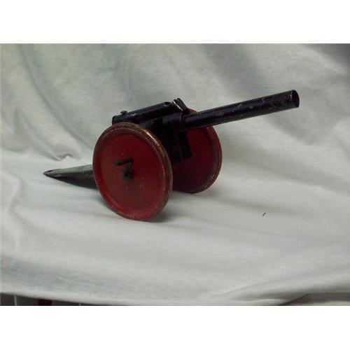 This is a older tin toy marble shooting cannon that works. There is no indication of the maker. The wheels are red and everything else is black. Marbles are loaded through a hole on top and fired by the crank on the wheel. This toy has been played with and shows some paint wear otherwise the condition is excellent.