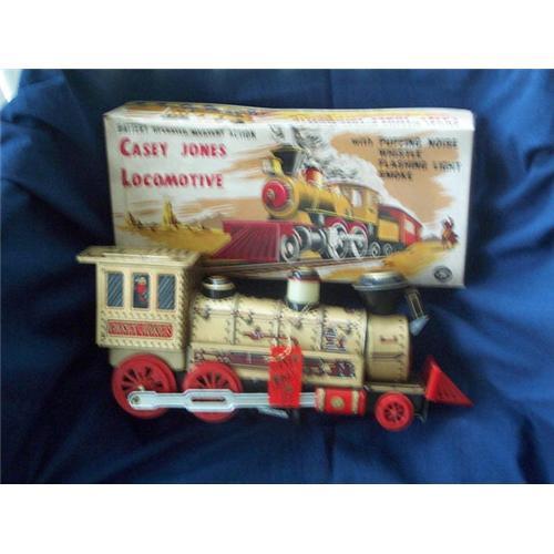 A battery operated toy train; Casey Jones locomotive in the original box. It is marked "Made in Japan by Modern Toys". Condition is mint, however, the box shows some minor wear. Locomotive features Puffing Noise, Whistle, Flashing Light, and Smoke. Uses 3 "D" Size batteries. Cow catcher and wheels are plastic.