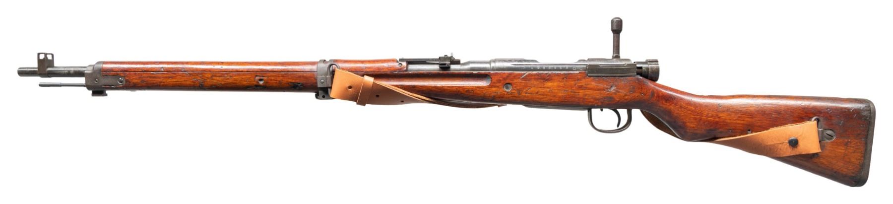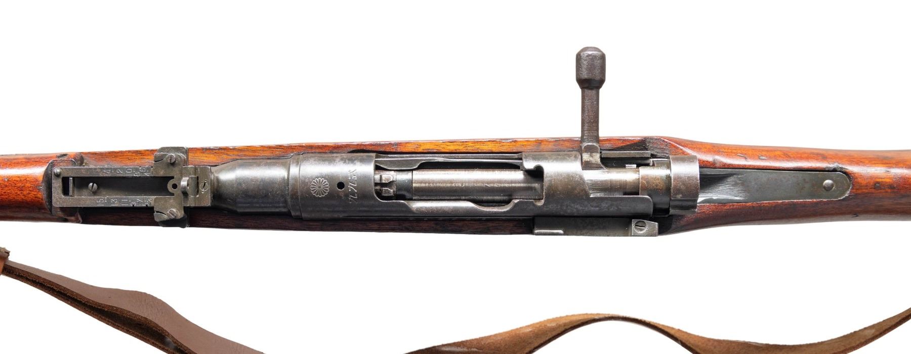 Cal. 7.7 Jap. S# 36963. Bbl. 25 7/8". Blade front sight with protective ears. Ladder aperture rear sight graduated to 1500m that is missing its AA wings. Bolt is a mismatched late war type & bayonet lug is unnumbered. Receiver top has fully intact mum & Type 99 markings. Left side of receiver has Toyo Kogyo & 30th series markings. Blued finish. Hardwood stock with two piece butt, left side sling swivels & repro tan sling. Cleaning rod present. CONDITION: stock set appears to have some added finish with a few gouges, scattered dings, scratches & handling marks. Metal is mostly gray with some varnish overrun, traces of original blue, scattered oxidation & some pitting. Action functions properly when hand cycled. Very good bore. (25-3828/MJC). CURIO. $300-500.