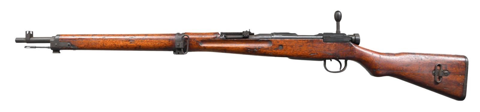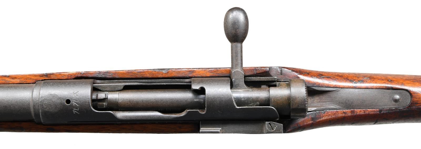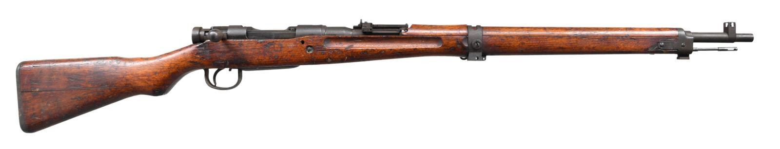 Cal. 7.7 Jap. S# 10831. Bbl. 25 1/2". Matching numbers on bolt, extractor, safety & firing pin. Bayonet lug is unnumbered. Top of receiver has ground mum & Type 99 markings. Left side of receiver has 32nd series marking, serial & Toyo Koygo markings. Ladder rear sight graduated to 1500m w/ AA wings. Blade front sight w/ protective ears. Asian two-piece hardwood stock set w/ left side sling swivels. Cleaning rod present. CONDITION: stock set shows scattered dings, stains & handling wear. Metal is an overall dull brown patina w/ scattered oxidation. Very good bore. (23-1981/MJC). CURIO. $300-400.