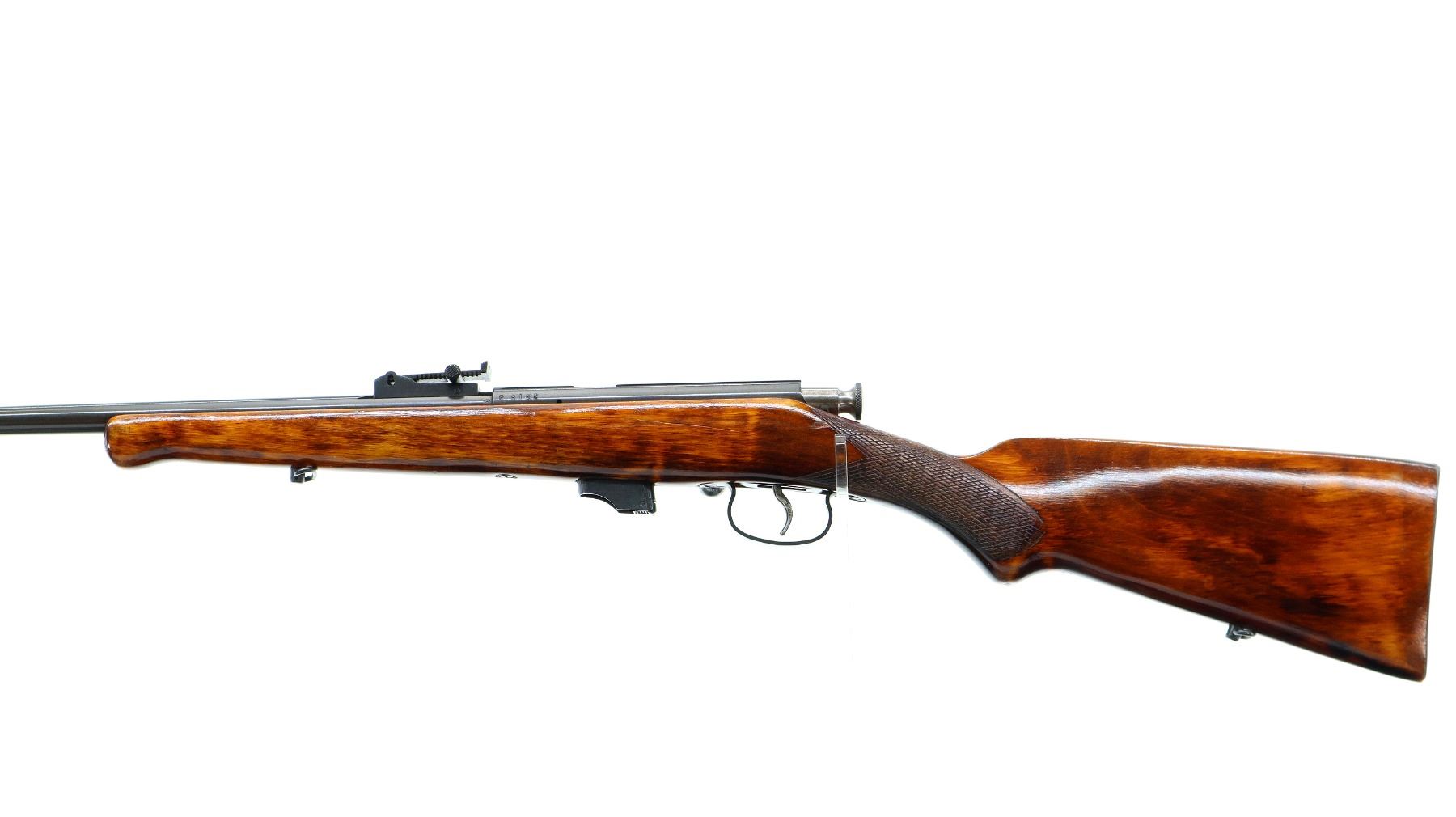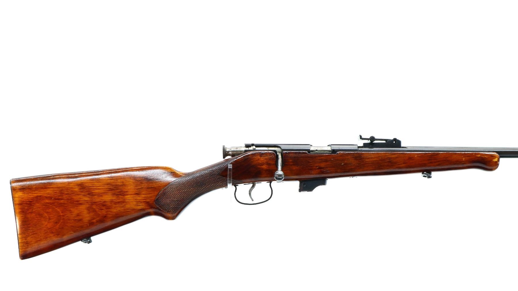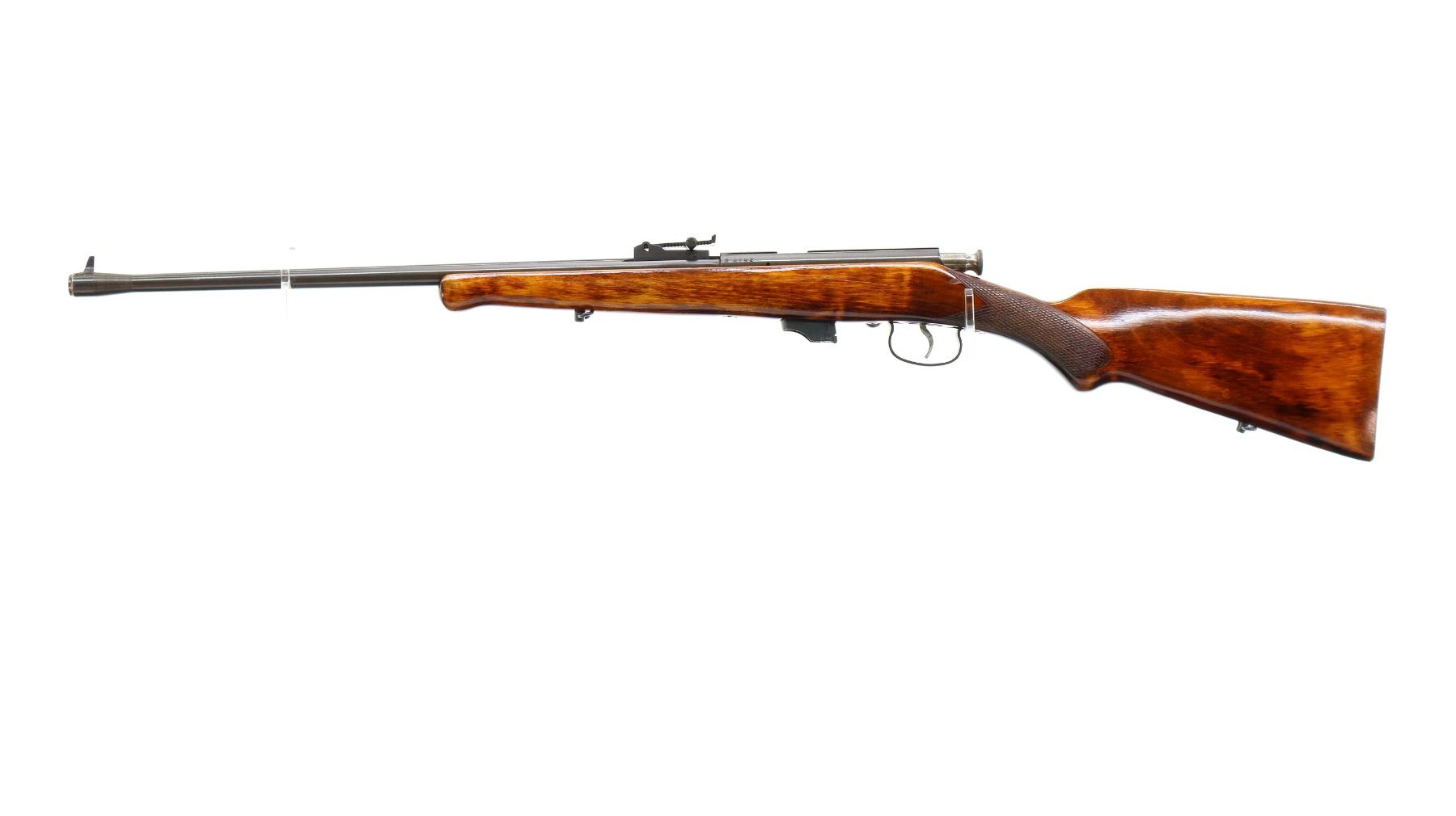 Main Description: Blade front sight, adjustable u notched rear sight, blued finish, grooved receiver, smooth bolt knob. One piece wood stock, checkered pistol grip, smooth steel butt plate, sling swivels.