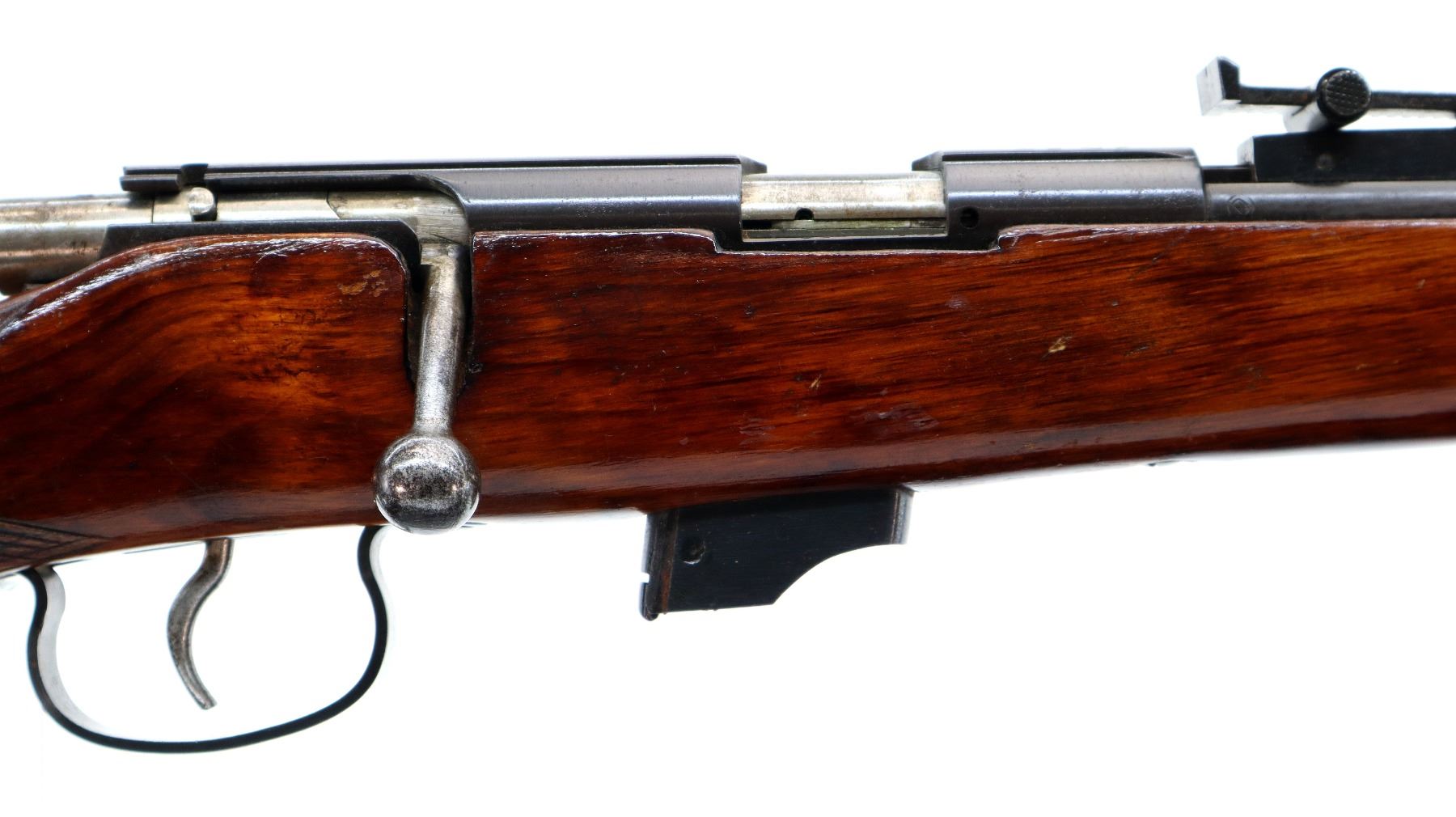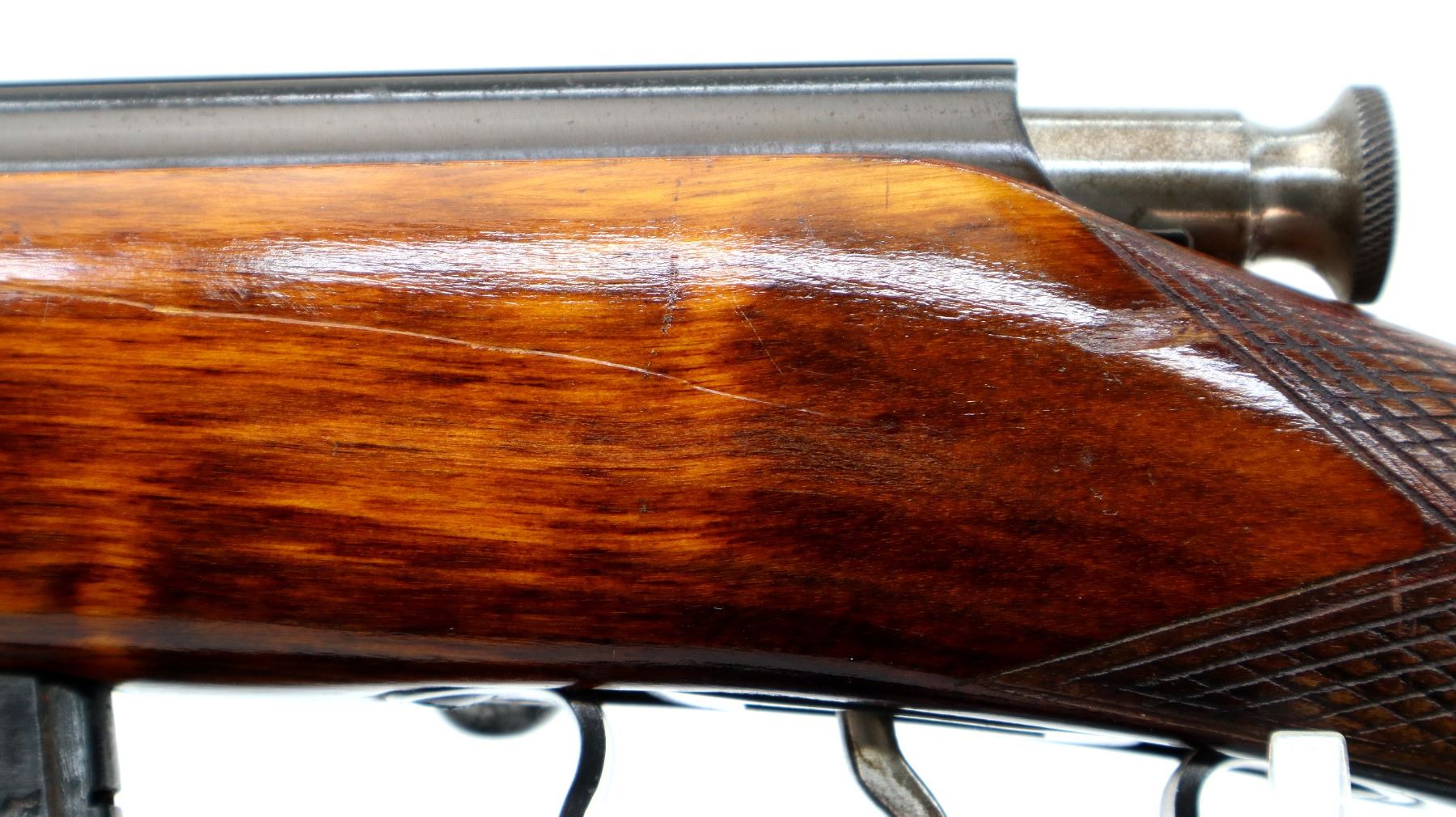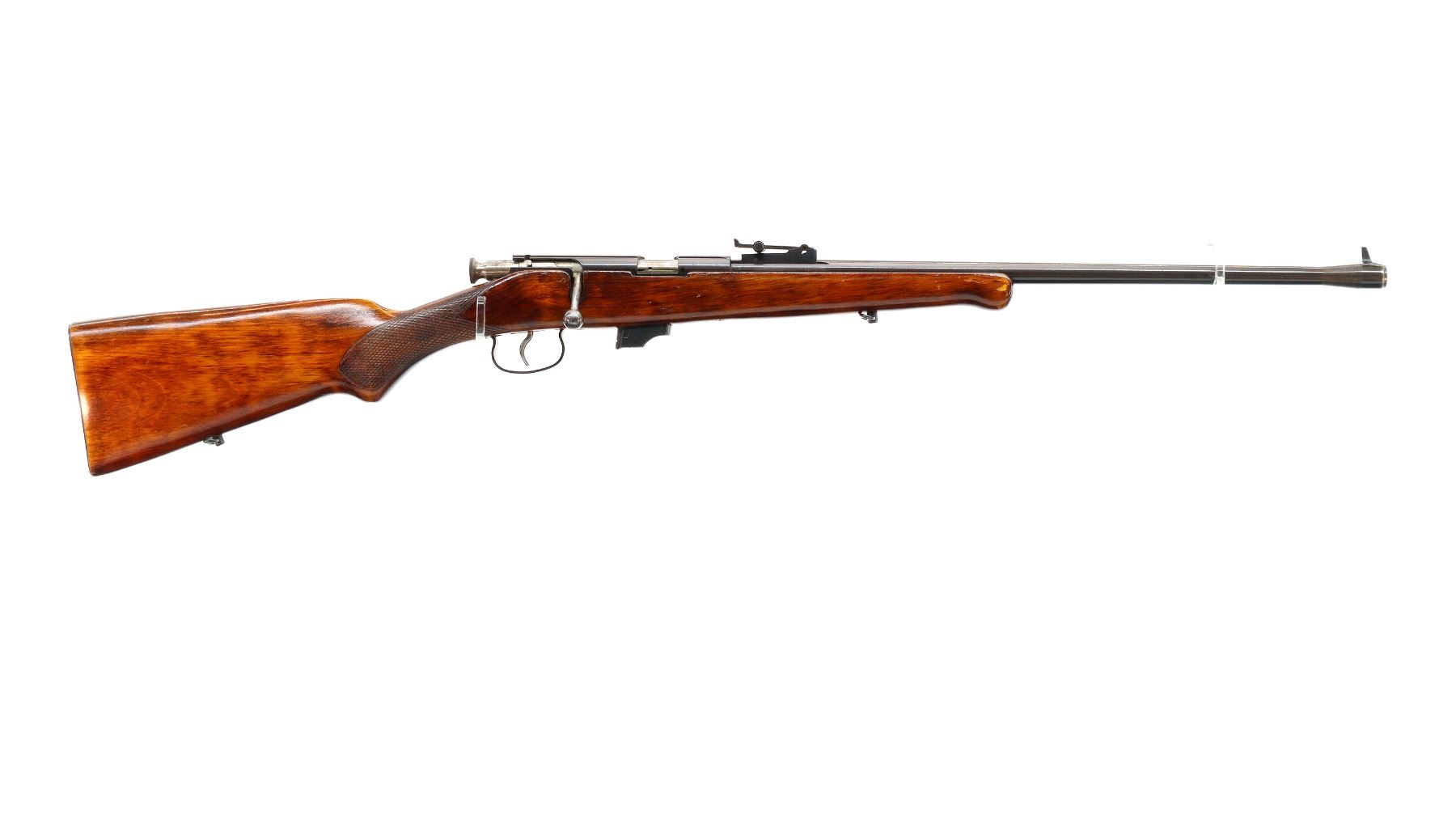 Main Description: Blade front sight, adjustable u notched rear sight, blued finish, grooved receiver, smooth bolt knob. One piece wood stock, checkered pistol grip, smooth steel butt plate, sling swivels.