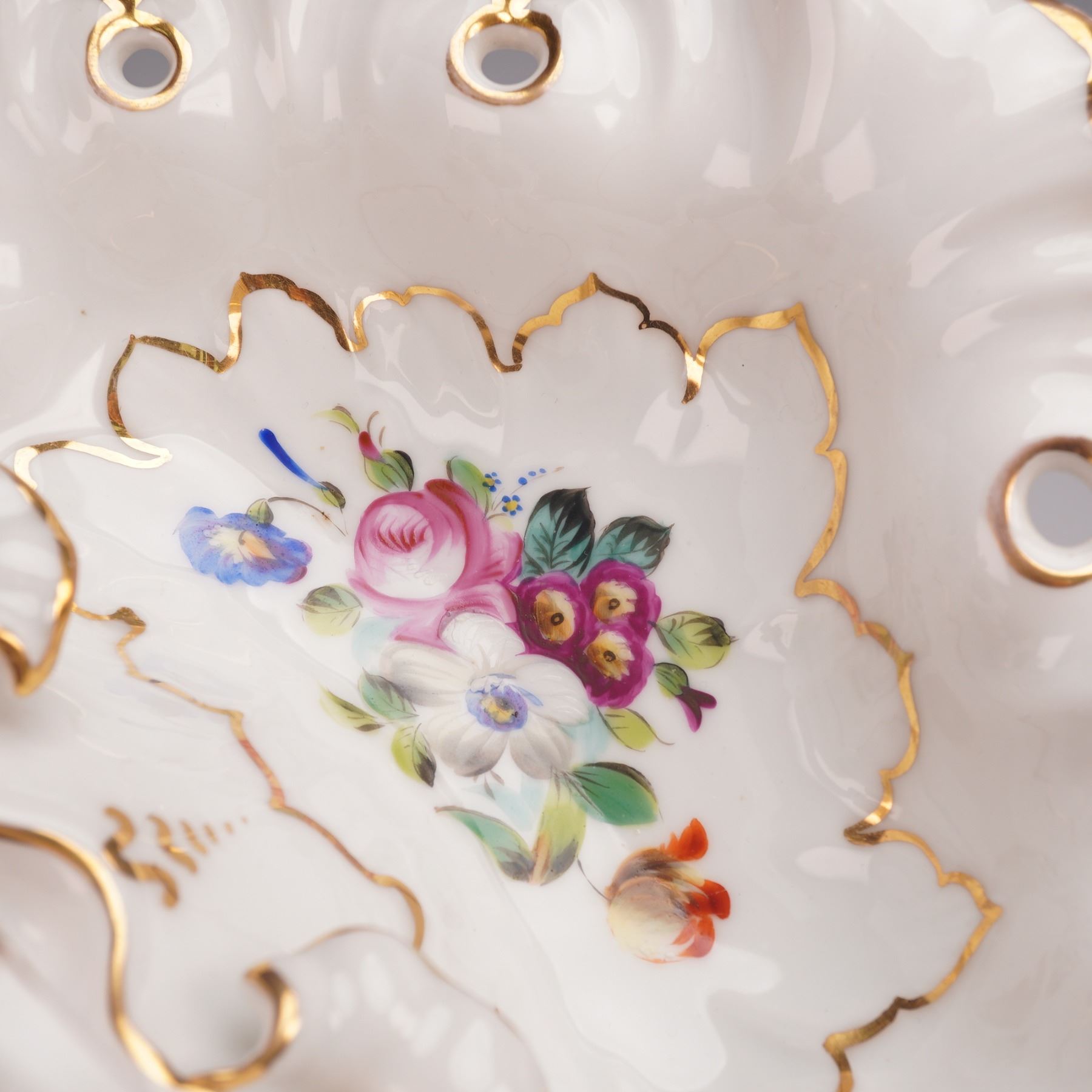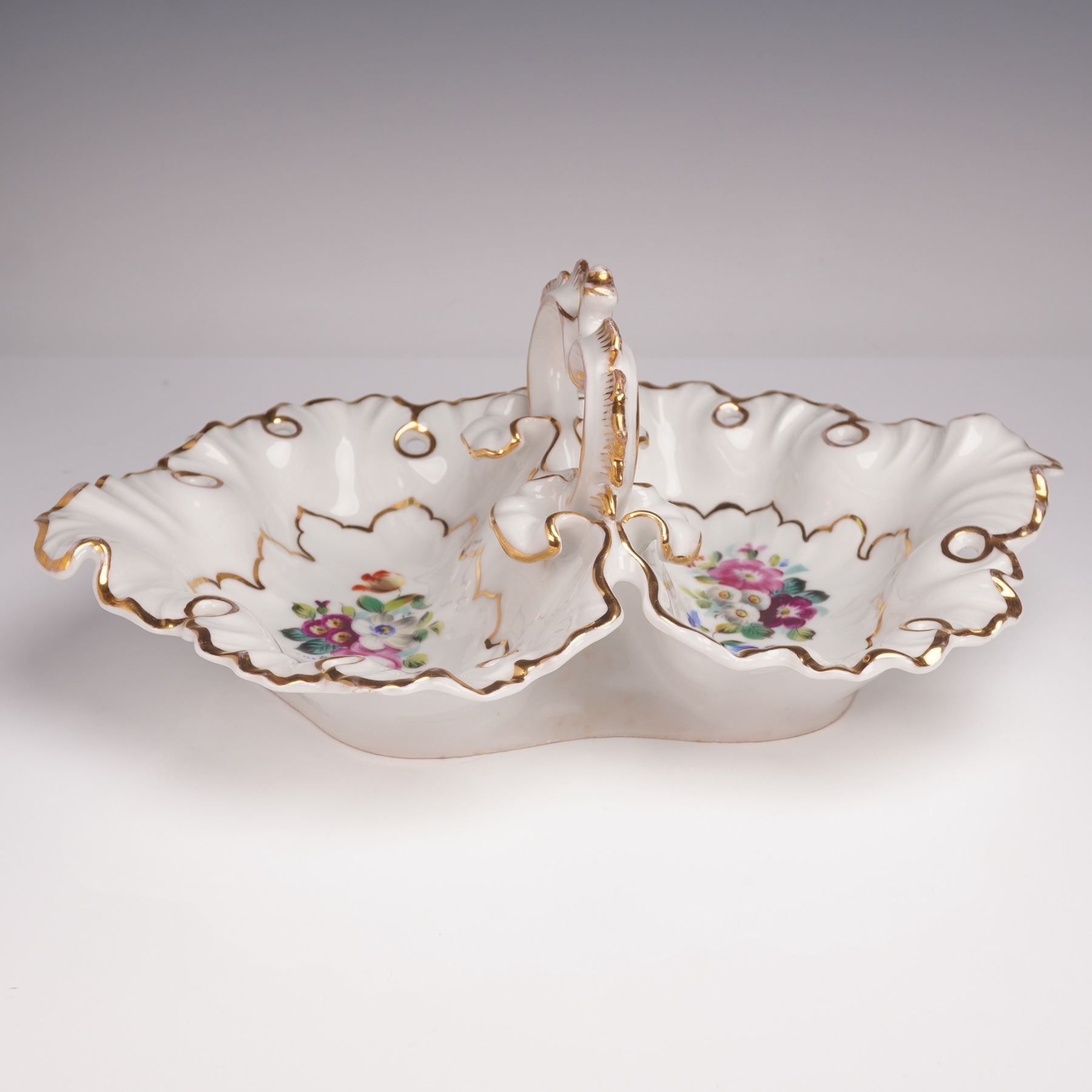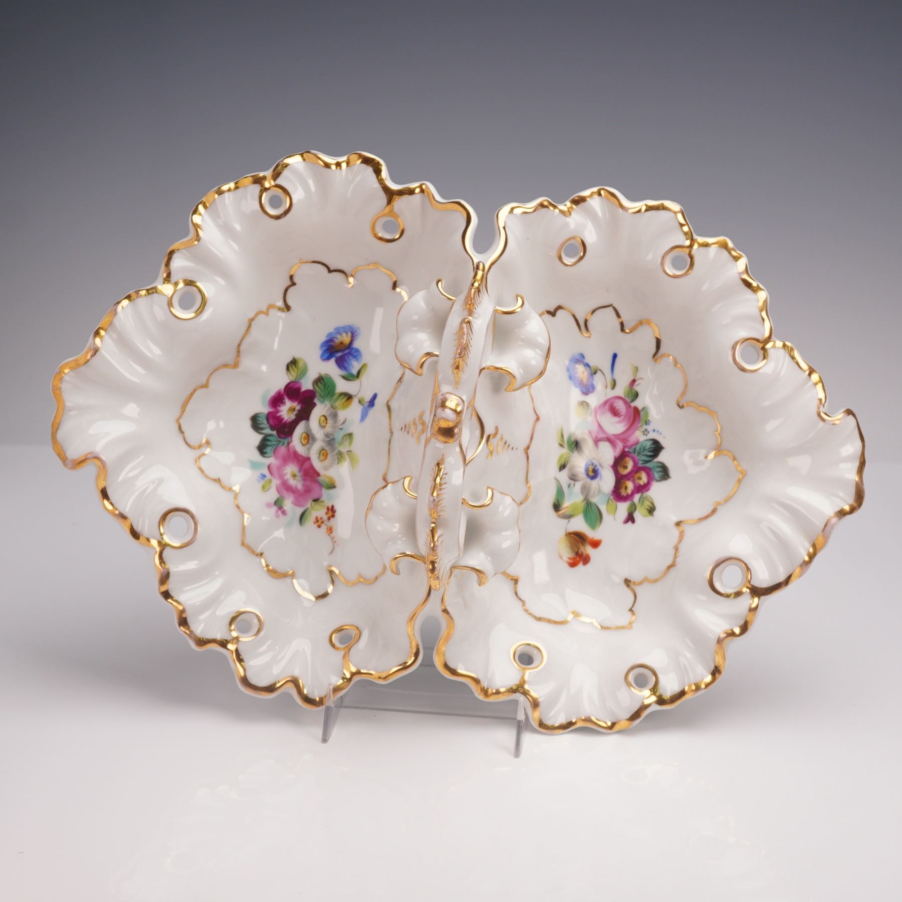 A porcelain divided dish, formed with two scalloped compartments joined by a central arched handle embellished with raised ornamental detail. The surface is richly decorated with hand-painted floral sprays, set against a glossy white ground and framed by elaborate gilt accents along the ruffled and pierced rim. TPM backstamp.