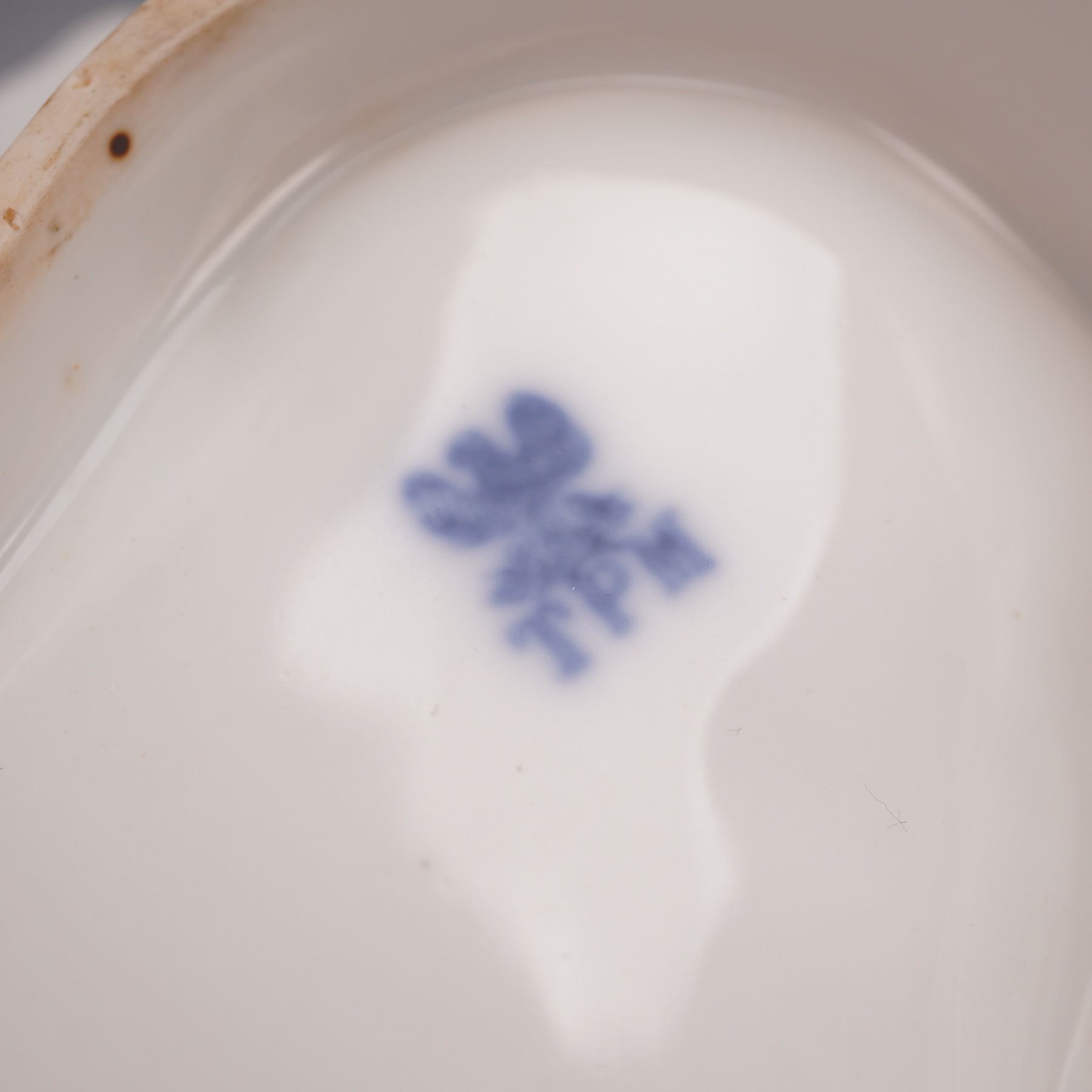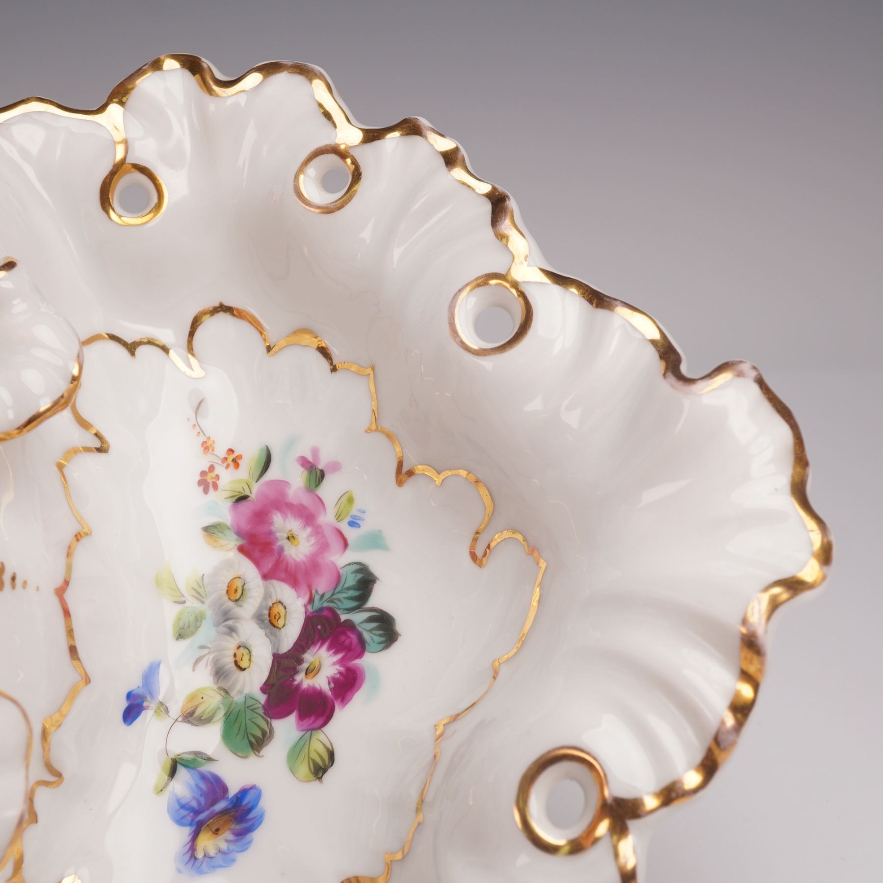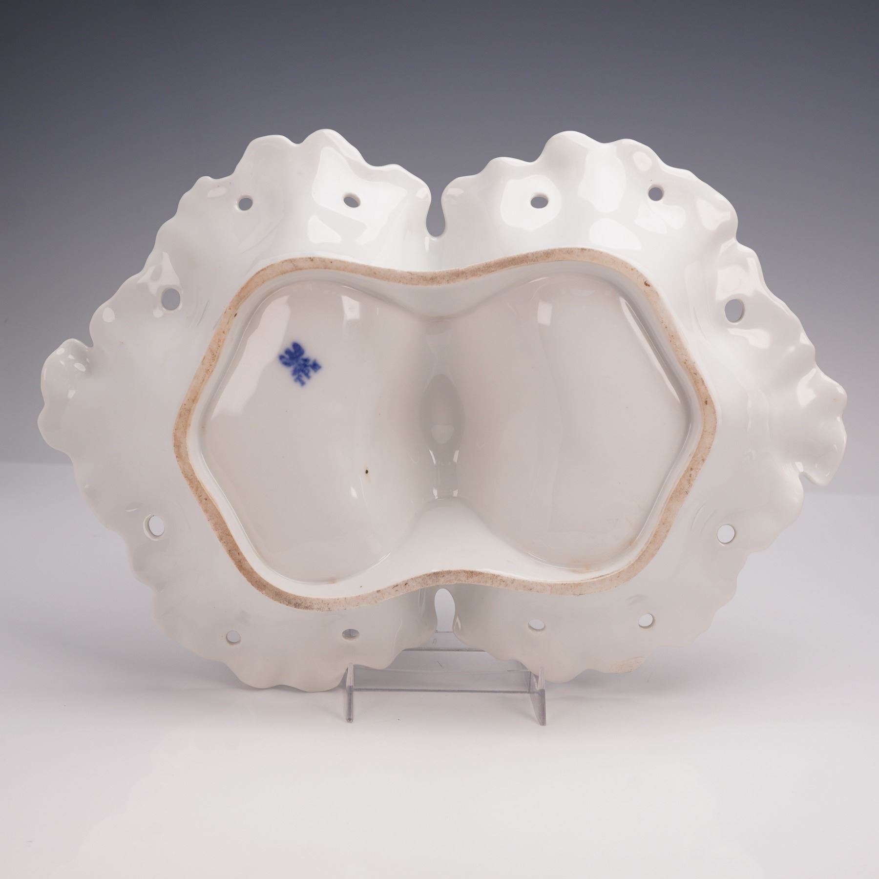 A porcelain divided dish, formed with two scalloped compartments joined by a central arched handle embellished with raised ornamental detail. The surface is richly decorated with hand-painted floral sprays, set against a glossy white ground and framed by elaborate gilt accents along the ruffled and pierced rim. TPM backstamp.